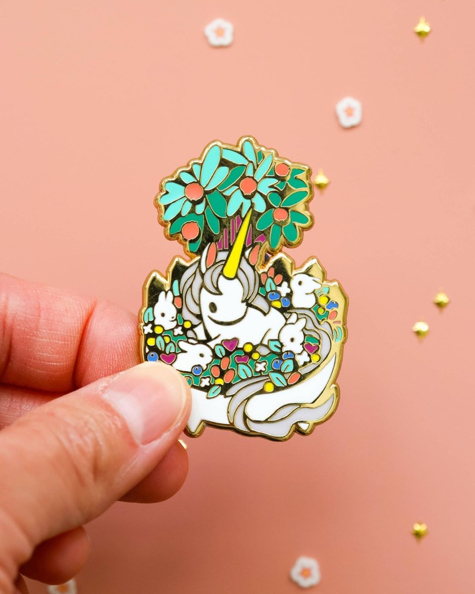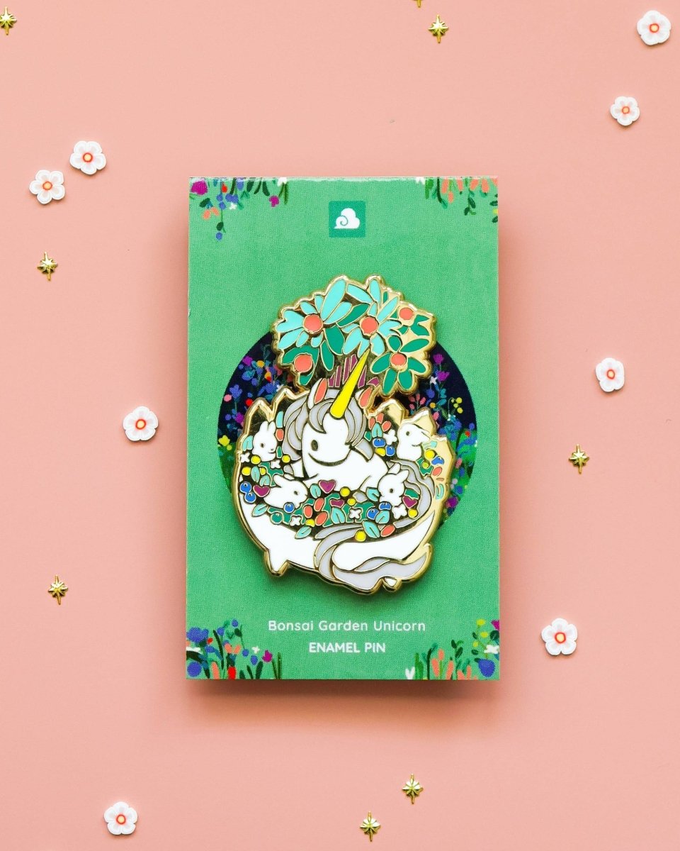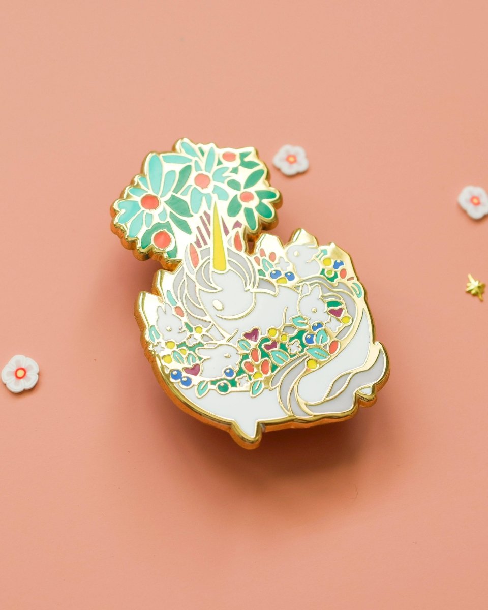 Emaljenål av en bonsaihage med en enhjørning omringet av søte kaniner✨