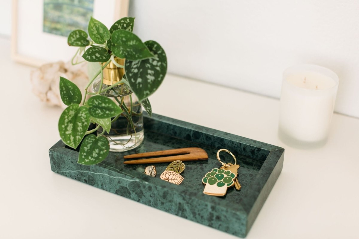 Vakker nøkkelring med original plante-illustrasjon fra Paper Anchor Company i hard emalje, innkapslet i messing og belagt med 18 karat gull. Denne bestselgeren er en perfekt gave for å feire et nytt hjem, henge på bilnøkkelen eller for å gi vesken din litt schwung.