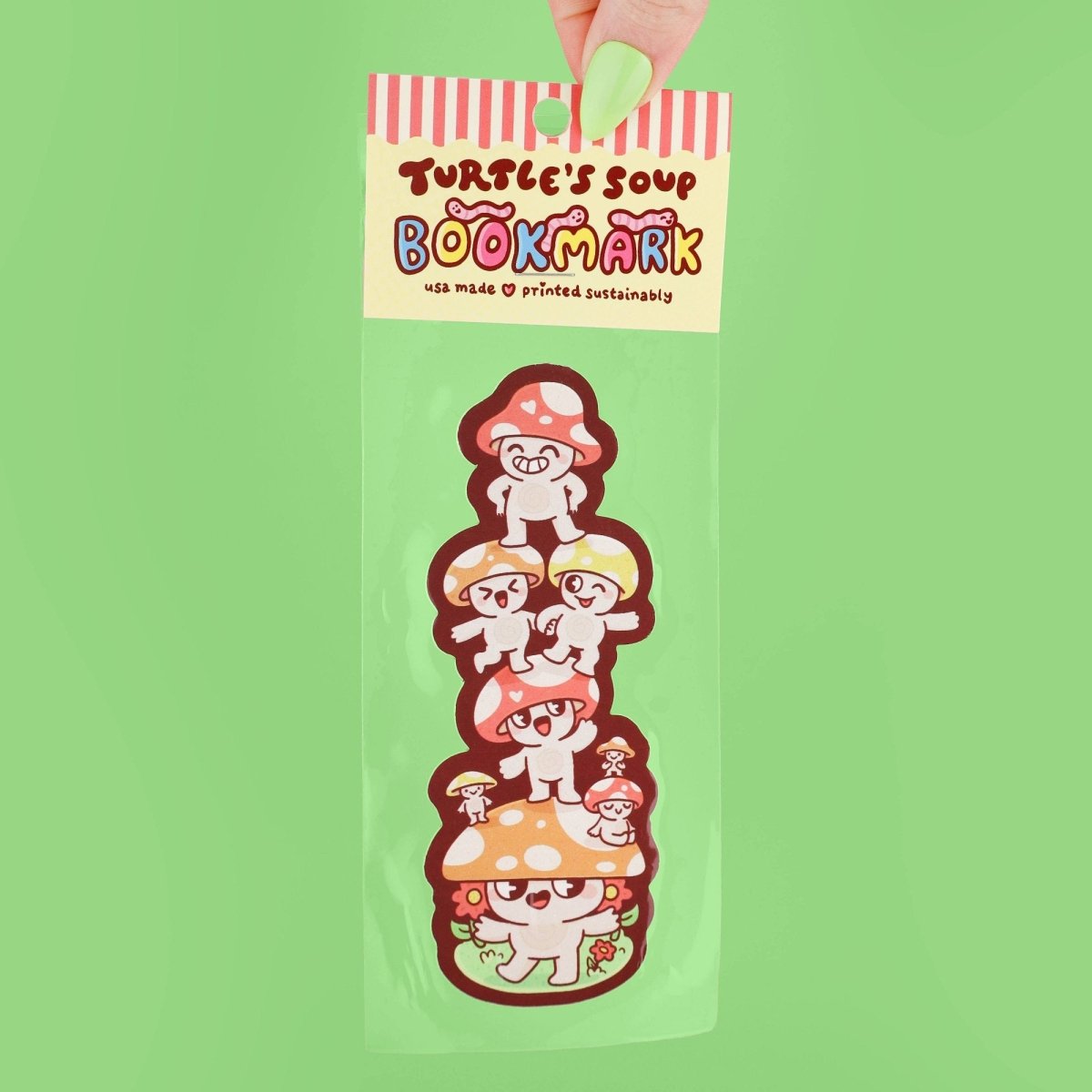 Bokmerke med sopper, på matt tykt papir. Bokmerket har forsiden av soppene på den ene siden og baksiden deres på den andre.