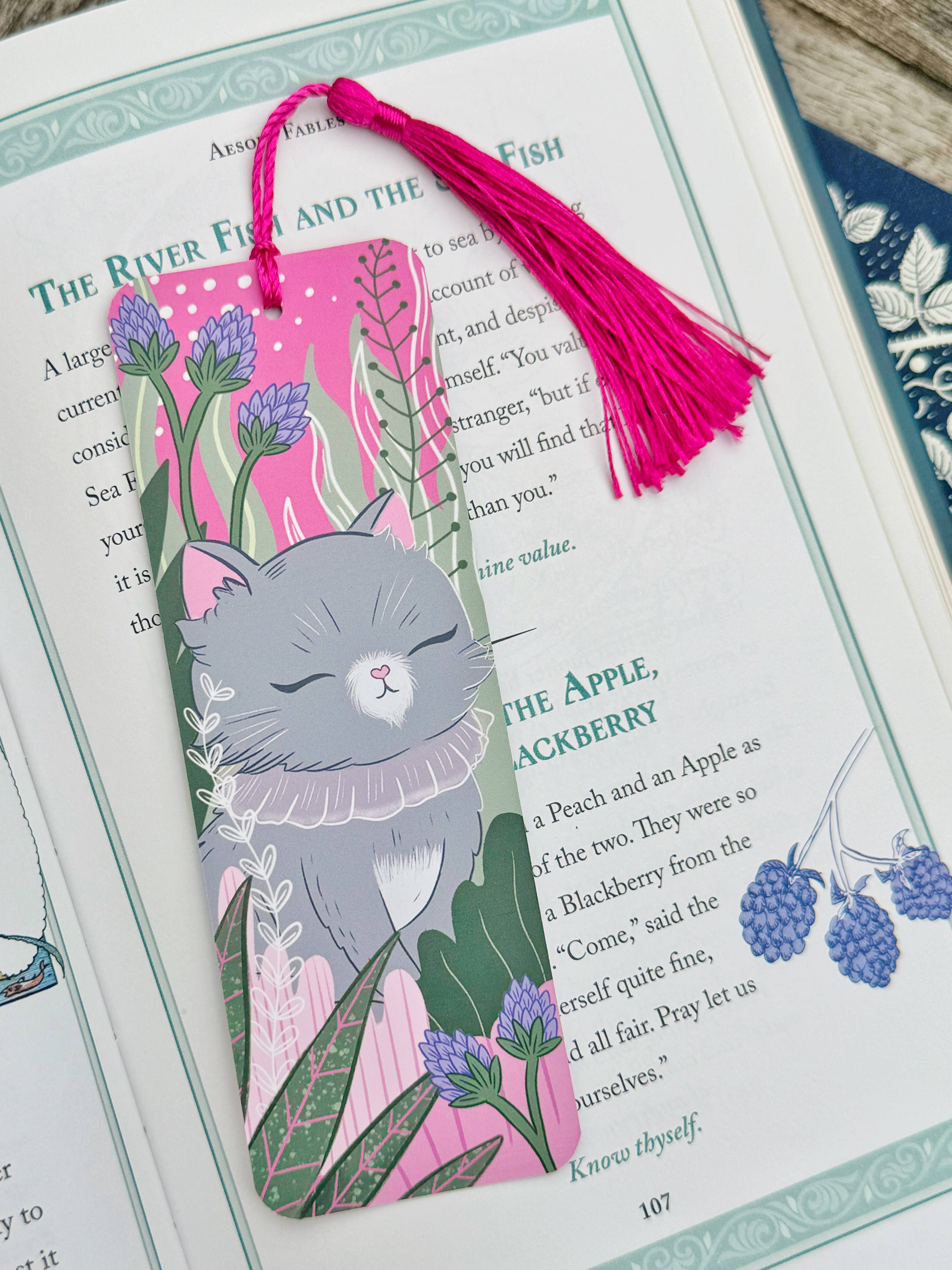 Dette dobbeltsidige bokmerket med rosa dusk har den søteste lille katten omgitt av blomster. Trykt på resirkulert tykt 350 g/m2 papir med matt laminat for å holde det vakkert.