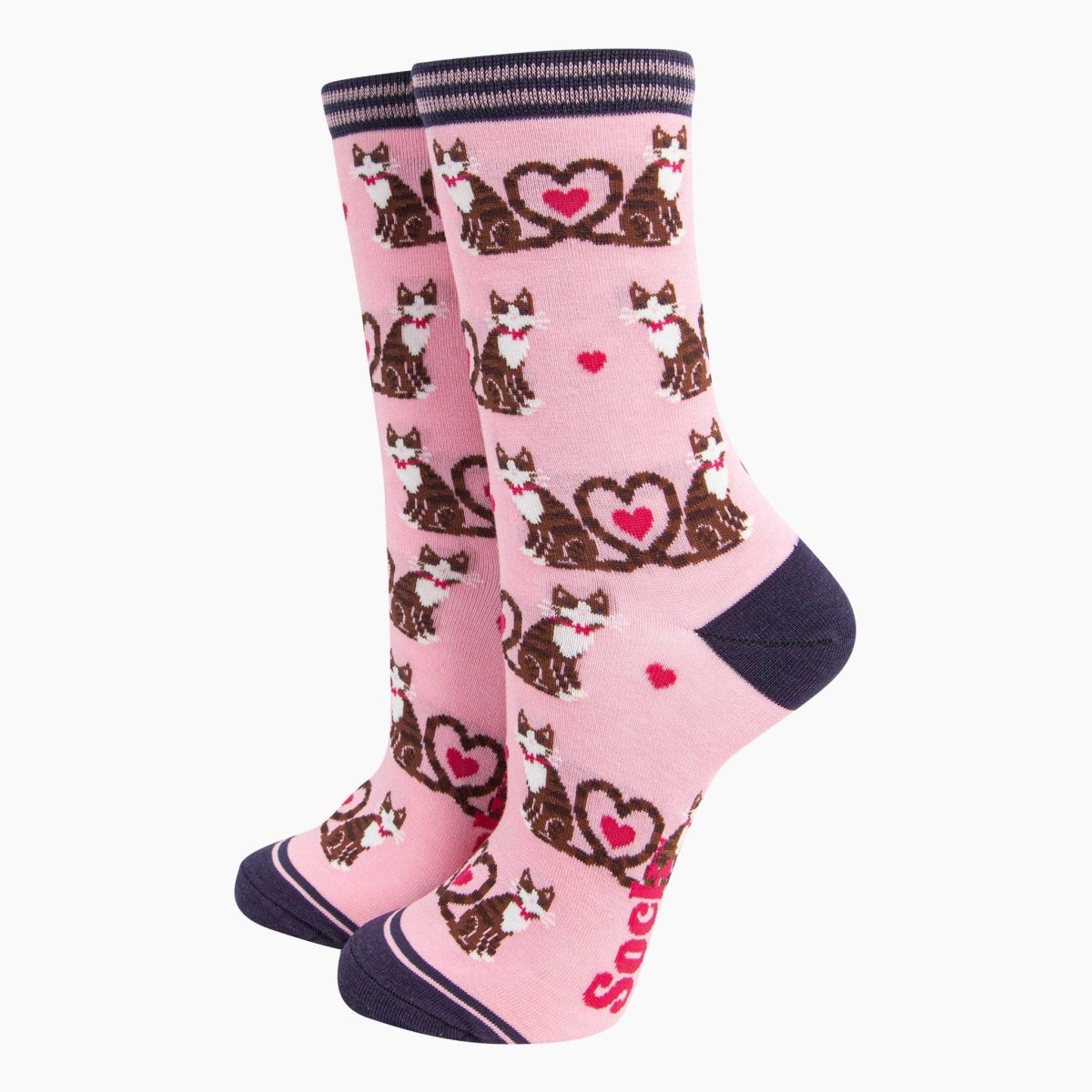 Bambussokker i rosa med katter som lager hjerteform med halene sine. Størrelse 36-40.