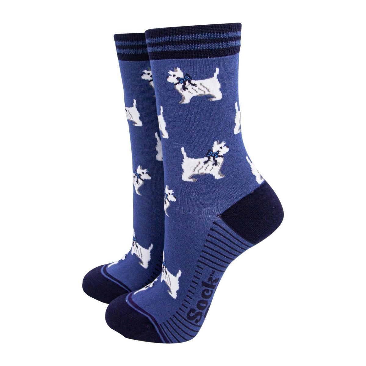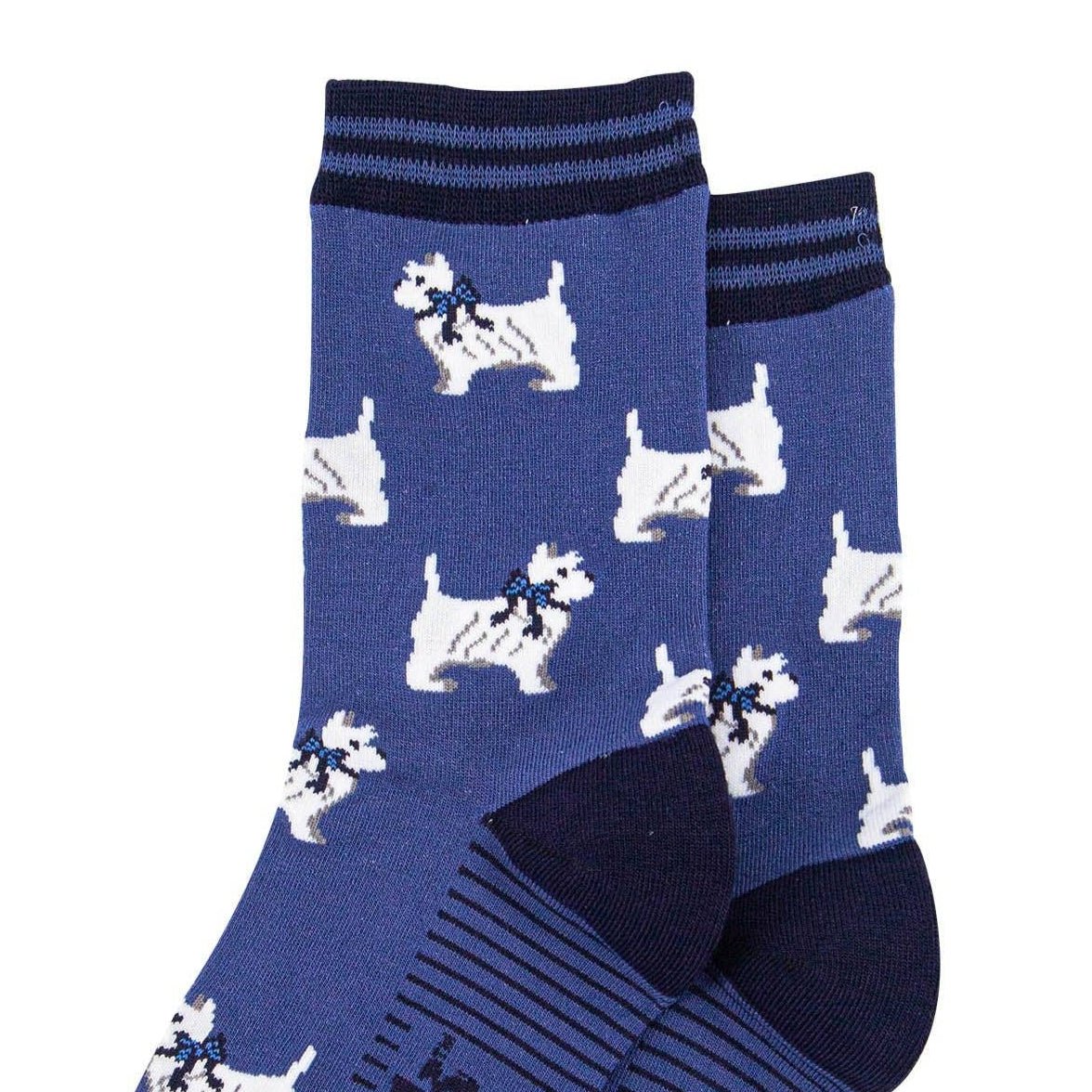 Bambussokker i blått med hvite hunder med sløyfer på. Størrelse 36-40.