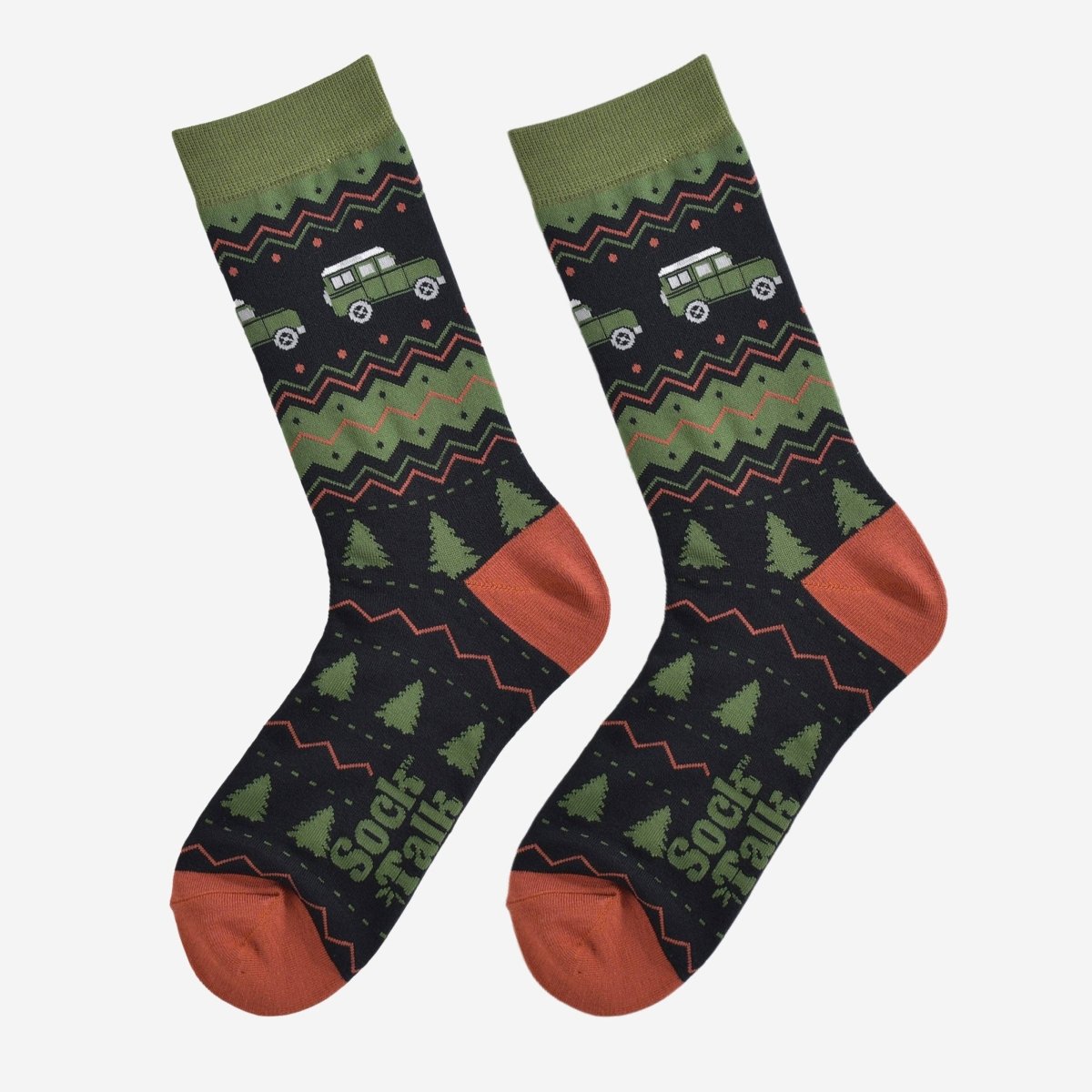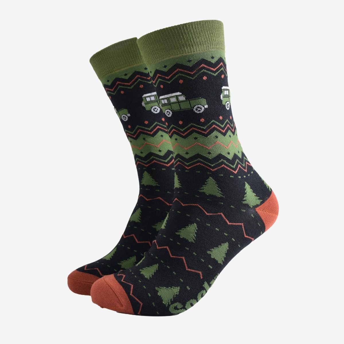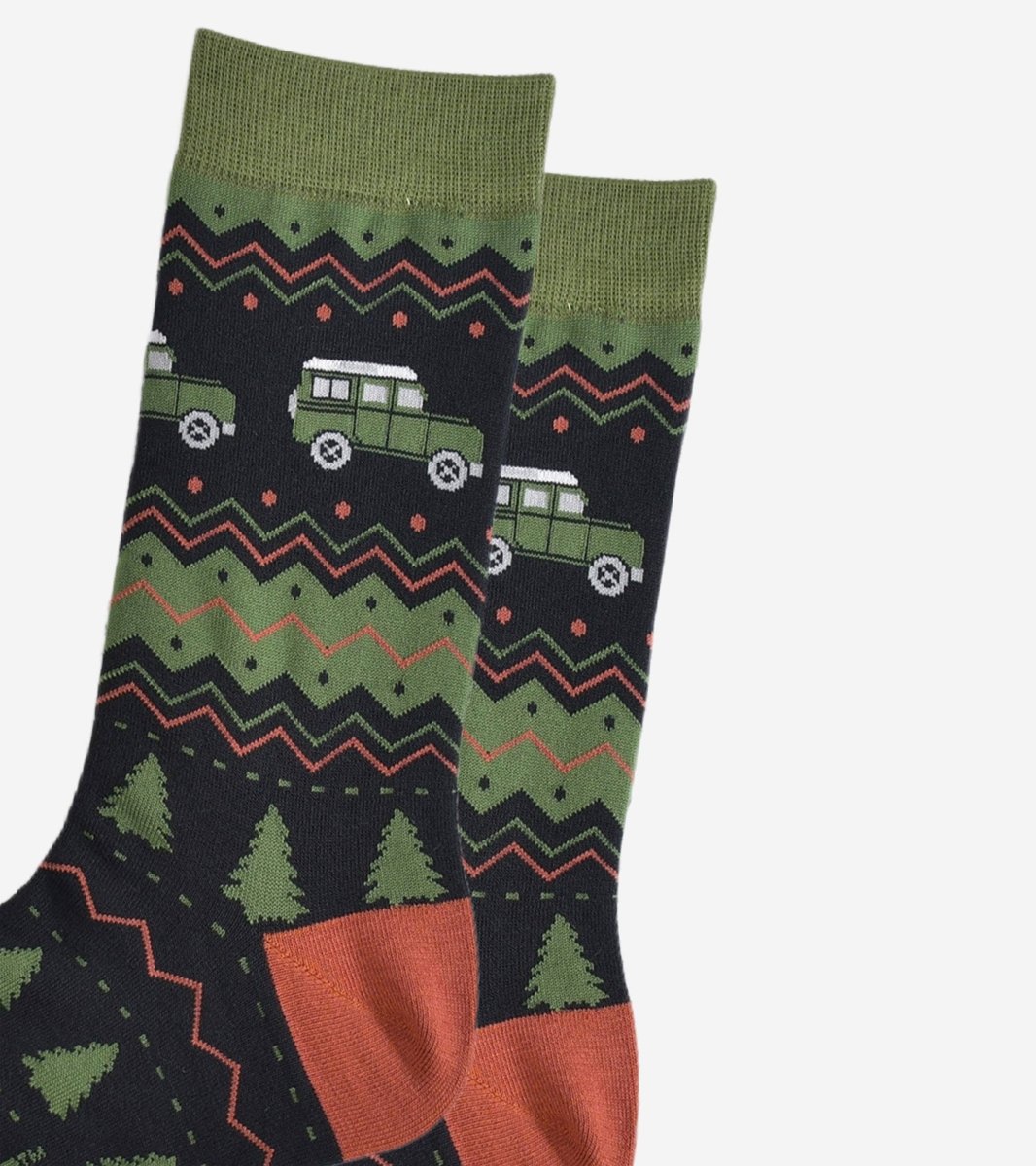 Bambussokker i sort og grønt, med trær og off road-biler. Størrelse 41-45.