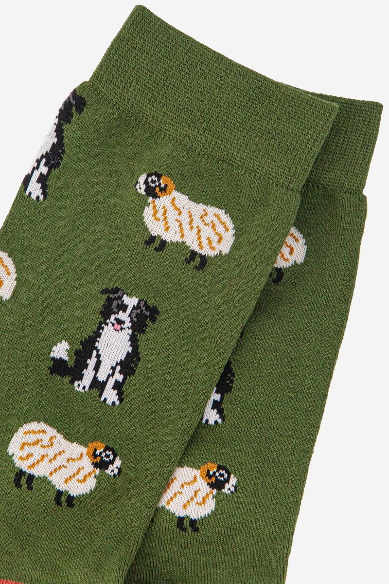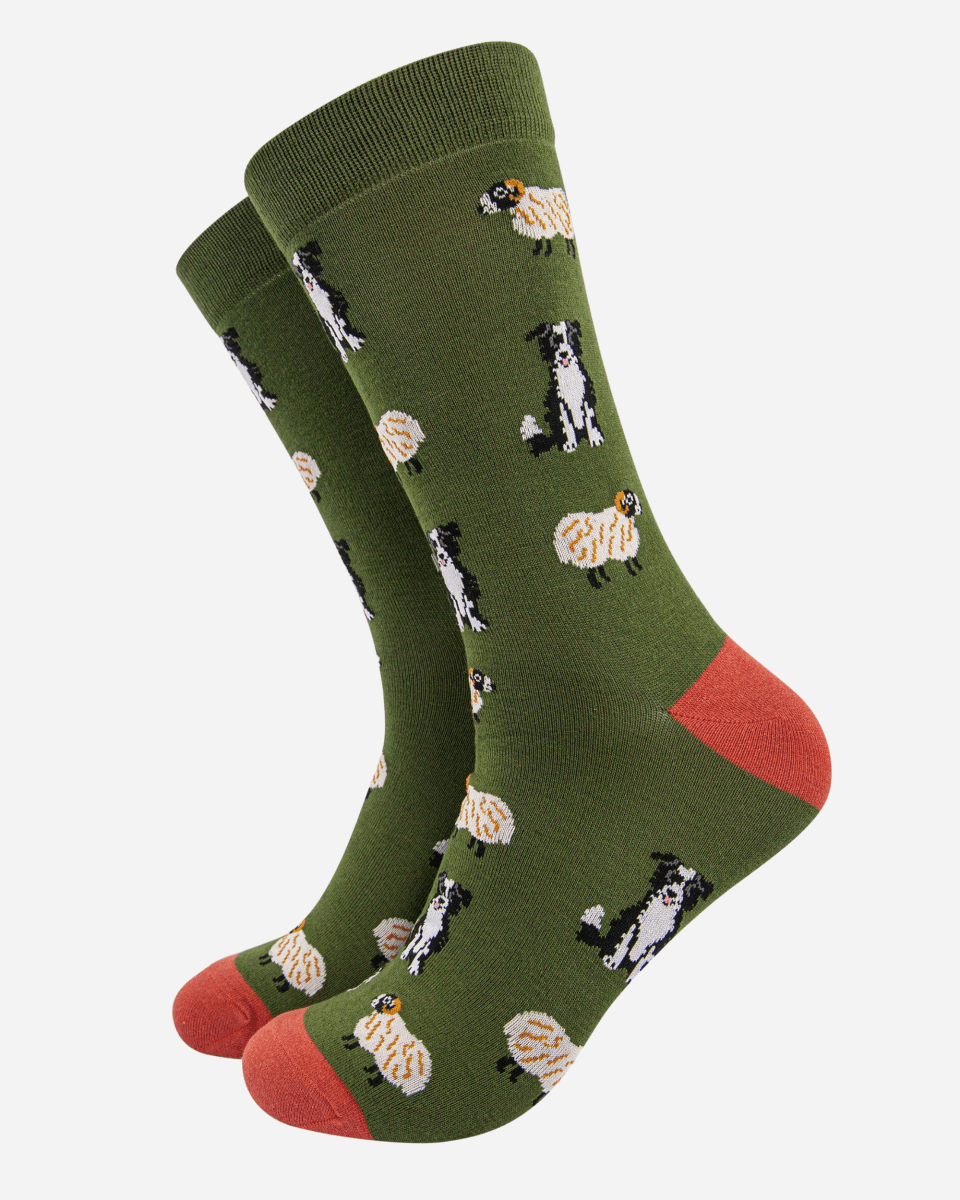 Bambussokker i grønt med gjetermotiv, border collie og sauer. Størrelse 41-45.