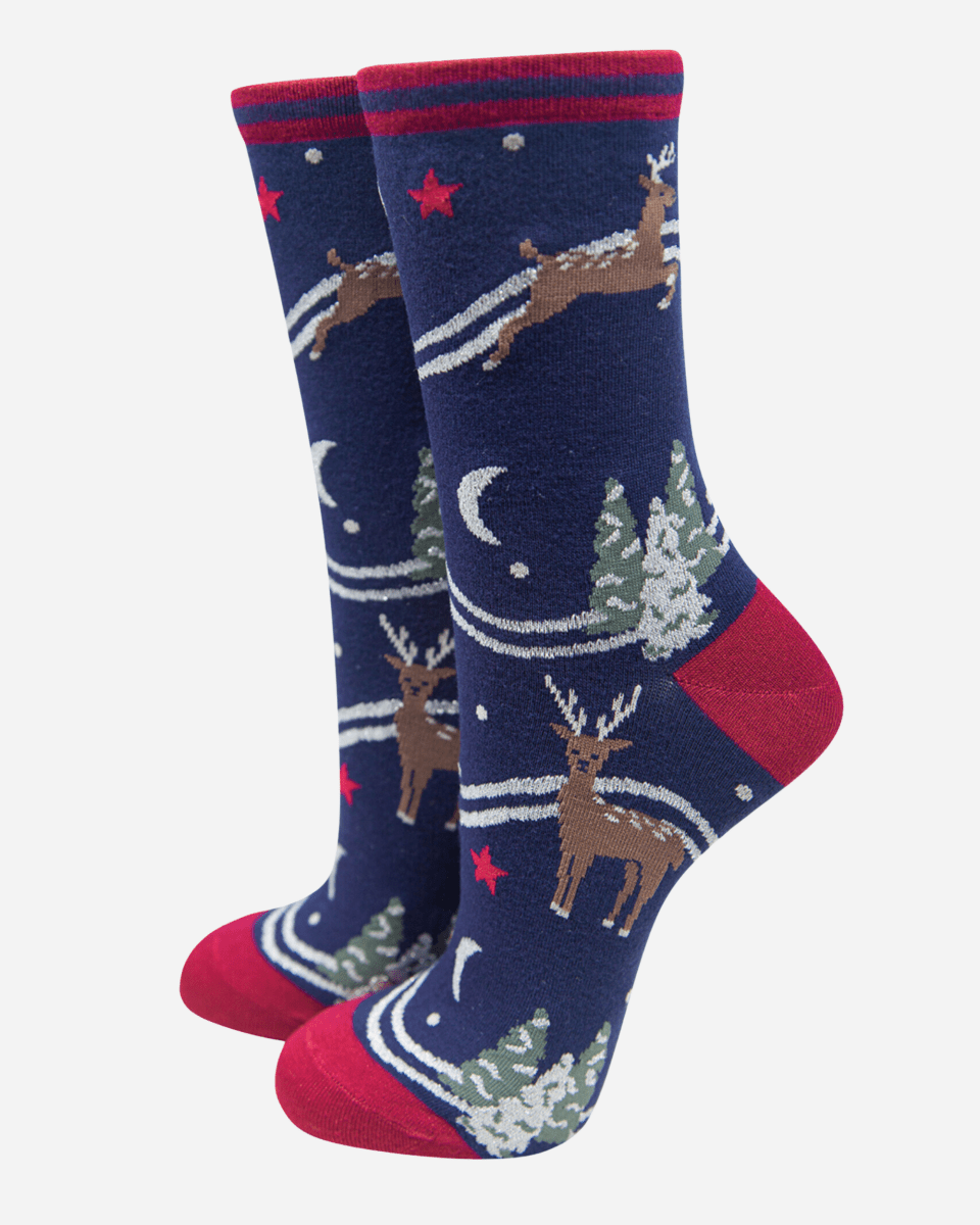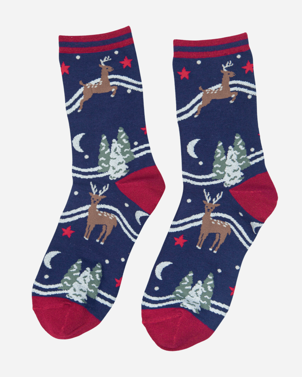 Bambussokker med nissens reinsdyr. Det hvite er glittertråd. Størrelse 36-40.