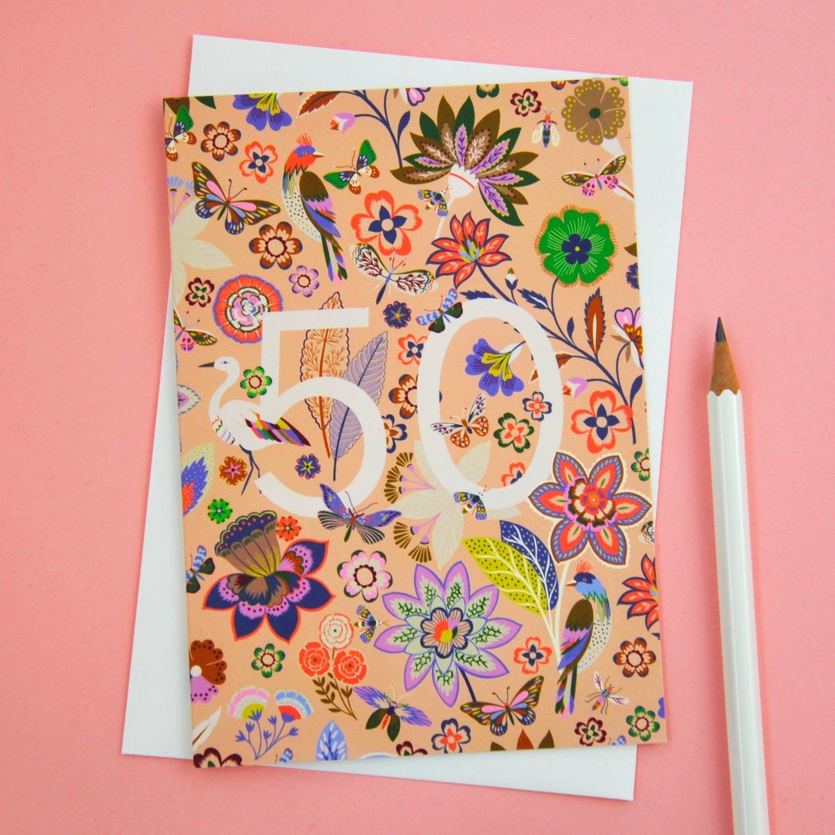 Et jubileumskort illustrert av Elvira Van Vredenburgh med nydelig motiv med blomster og fugler.