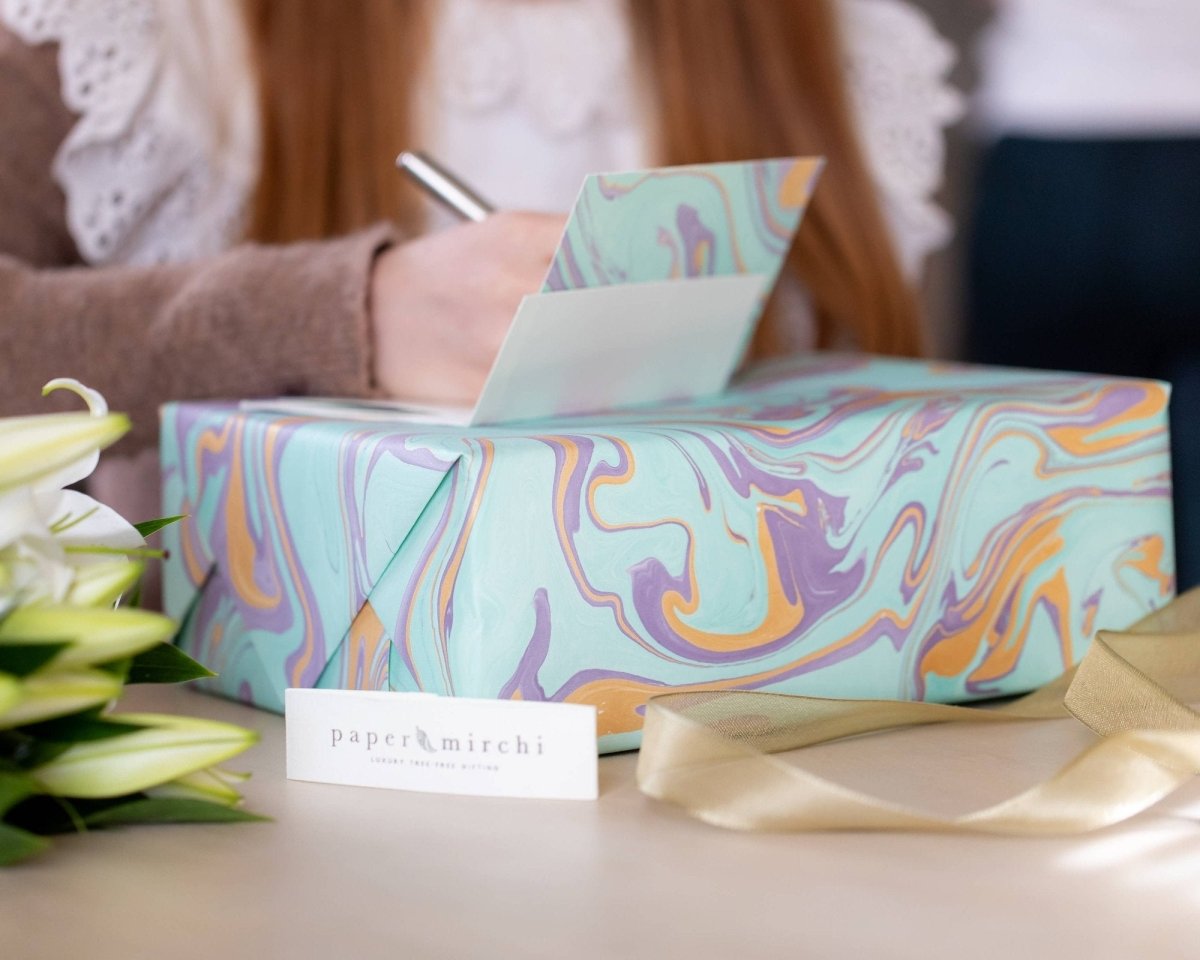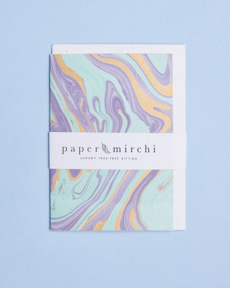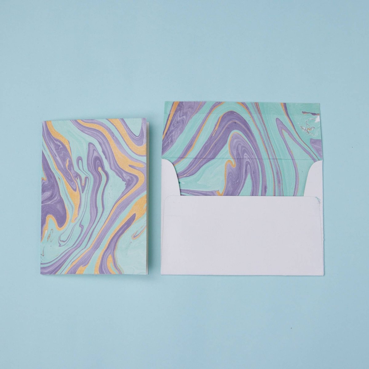 Marmorert kort laget av resirkulert bomullspapir. Hvert kort er laget av papir som er dyppet i vannkar med maling på overflaten - derfor er alle kortene unike små kunstverk!