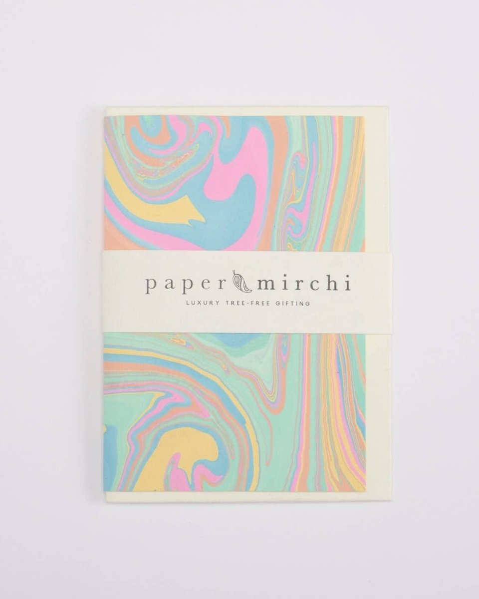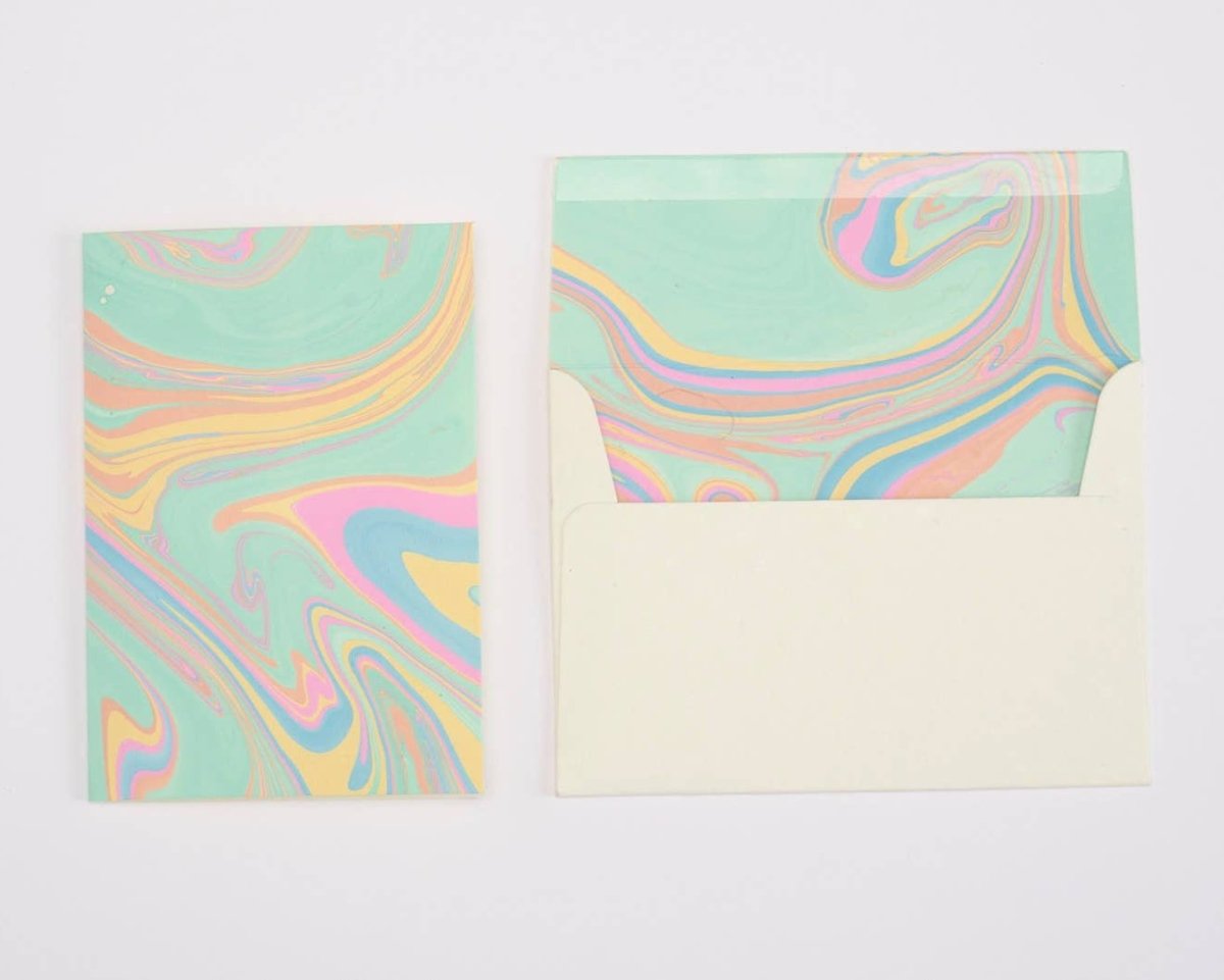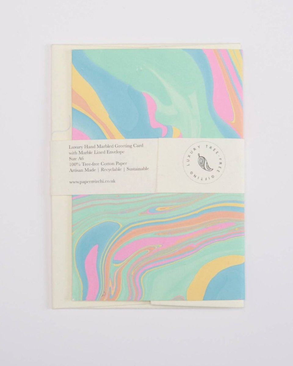 Marmorert kort laget av resirkulert bomullspapir. Hvert kort er laget av papir som er dyppet i vannkar med maling på overflaten - derfor er alle kortene unike små kunstverk!