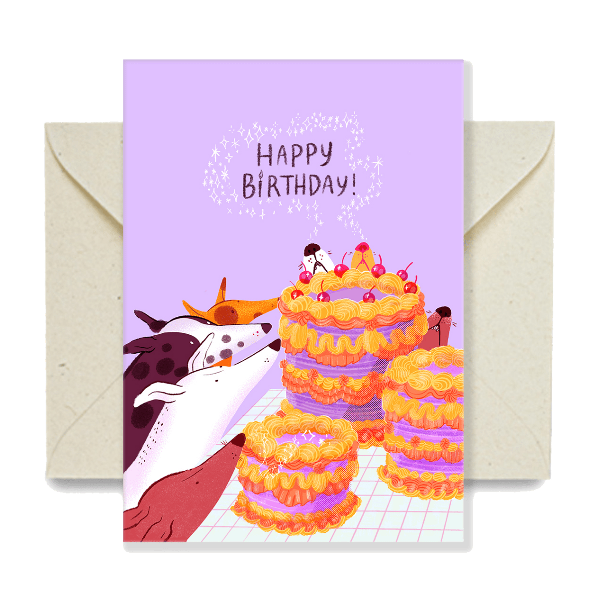 Gjør bursdagen ekstra minneverdig med et kort som sprudler av farger og en gjeng nysgjerrige mynder som har lokalisert kakene. Kortet er illustrert av Bryony Moss.