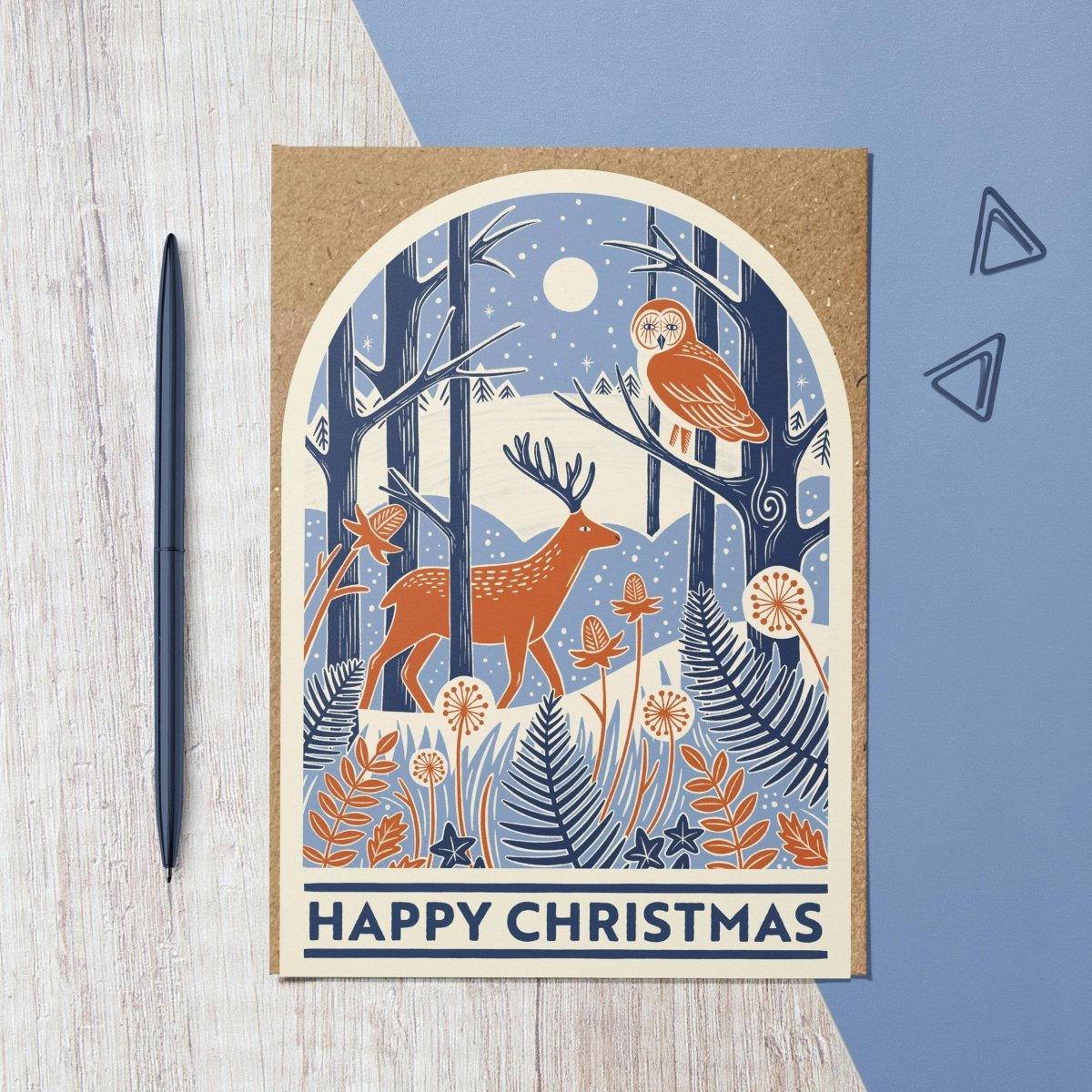 Et vakkert julekort som viser et vinterlandskap. Kortet er formet som en snøkule. På baksiden finner du tips til hvordan vi kan hjelpe dyrelivet i vintermånedene, og en donasjon er gitt til Wildlife Trust Charity for å støtte deres arbeid med å bevare og gjenopprette lokale, naturlige habitater.