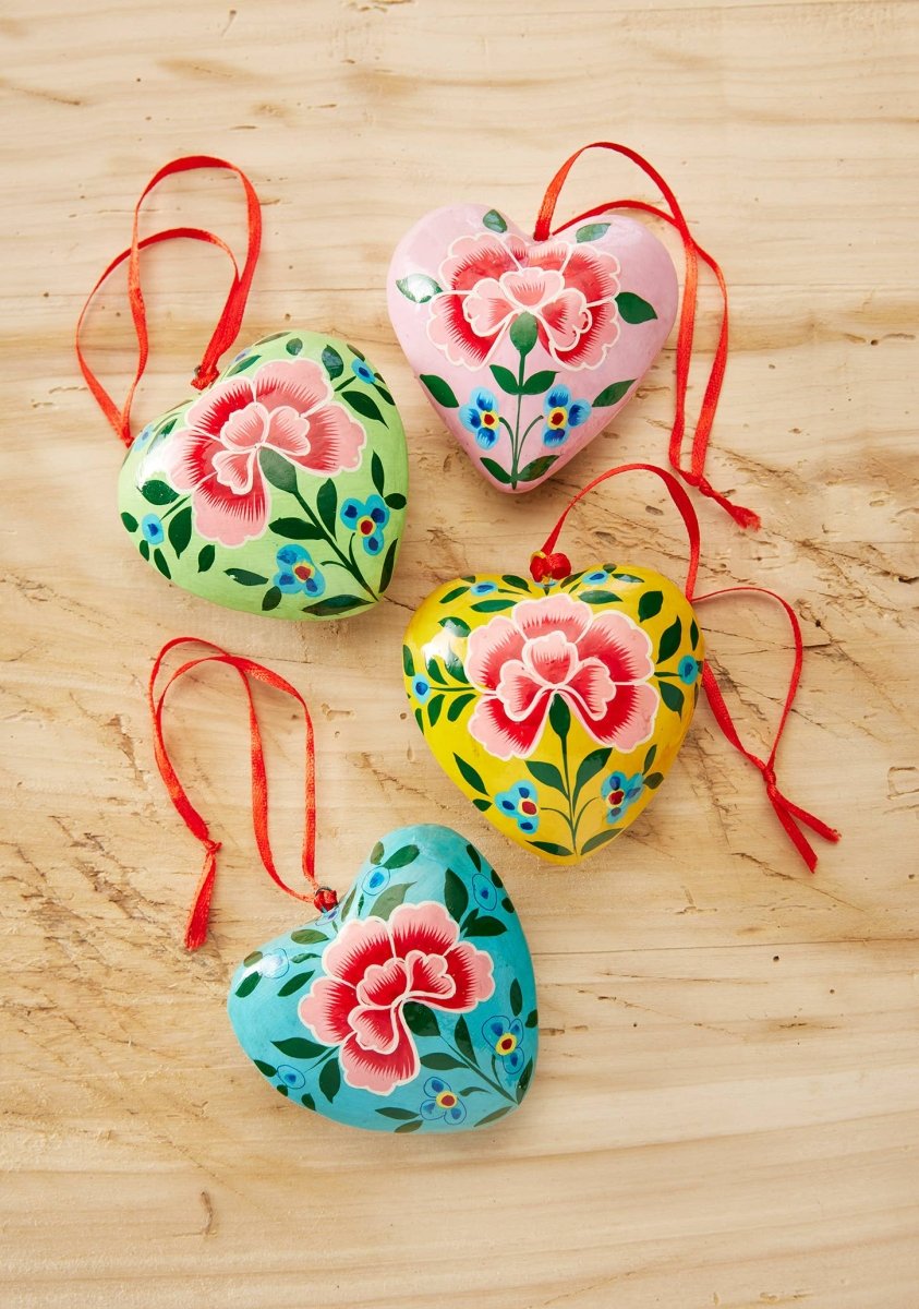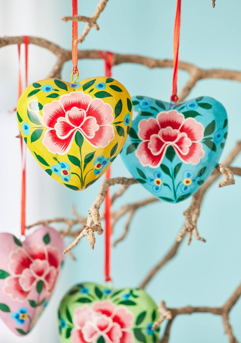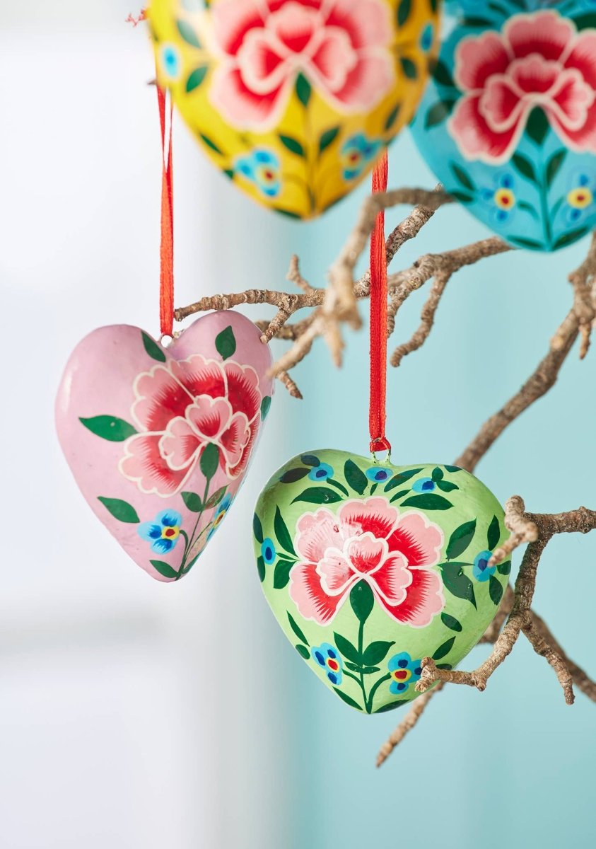 Dekorativ hjerteformet pynt, håndmalt med krysantemum-motiv. Tilgjengelig i fire fargevarianter og levert med rød opphengssnor.