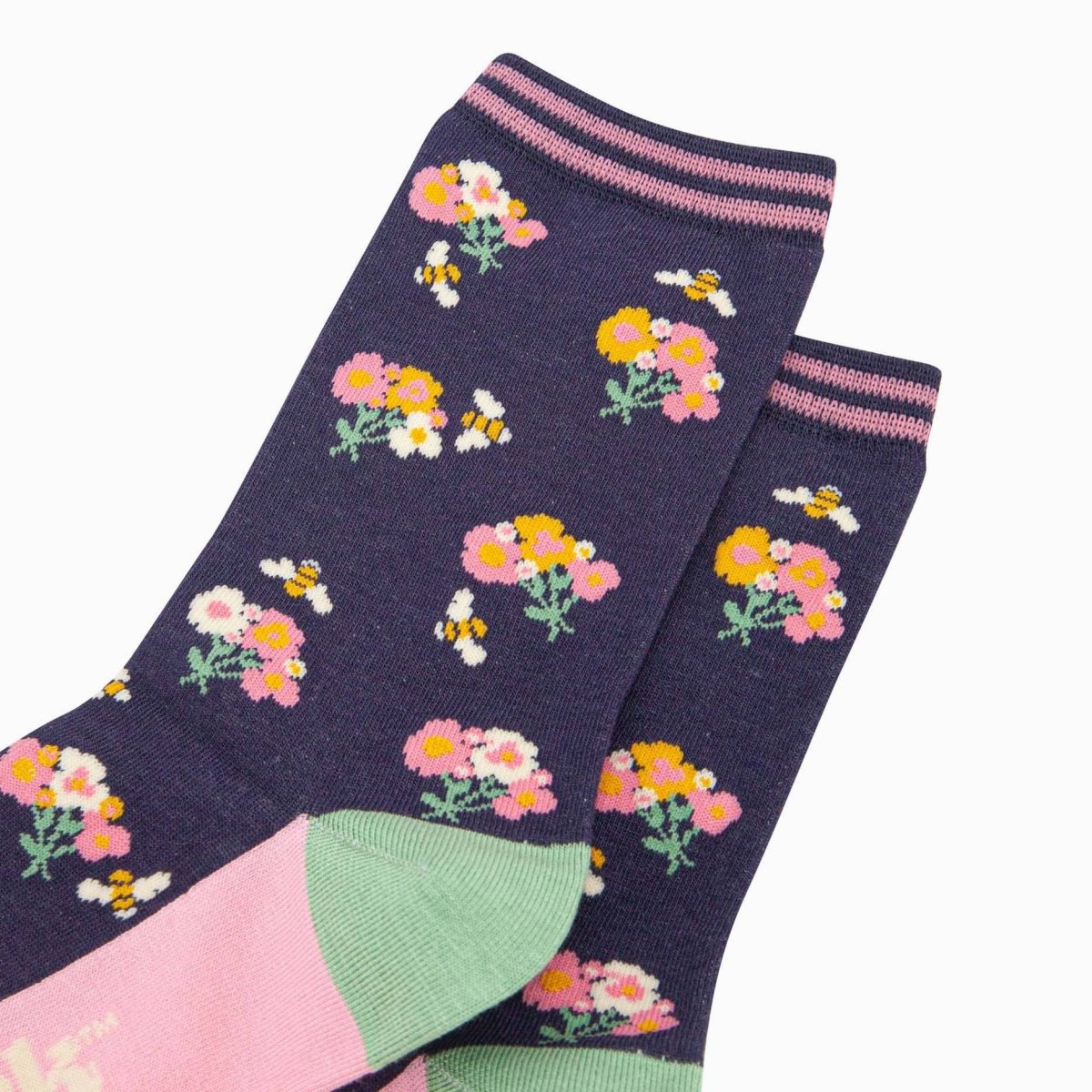 Bambussokker i marineblått med små blomsterbuketter og bier. Størrelse 36-40.