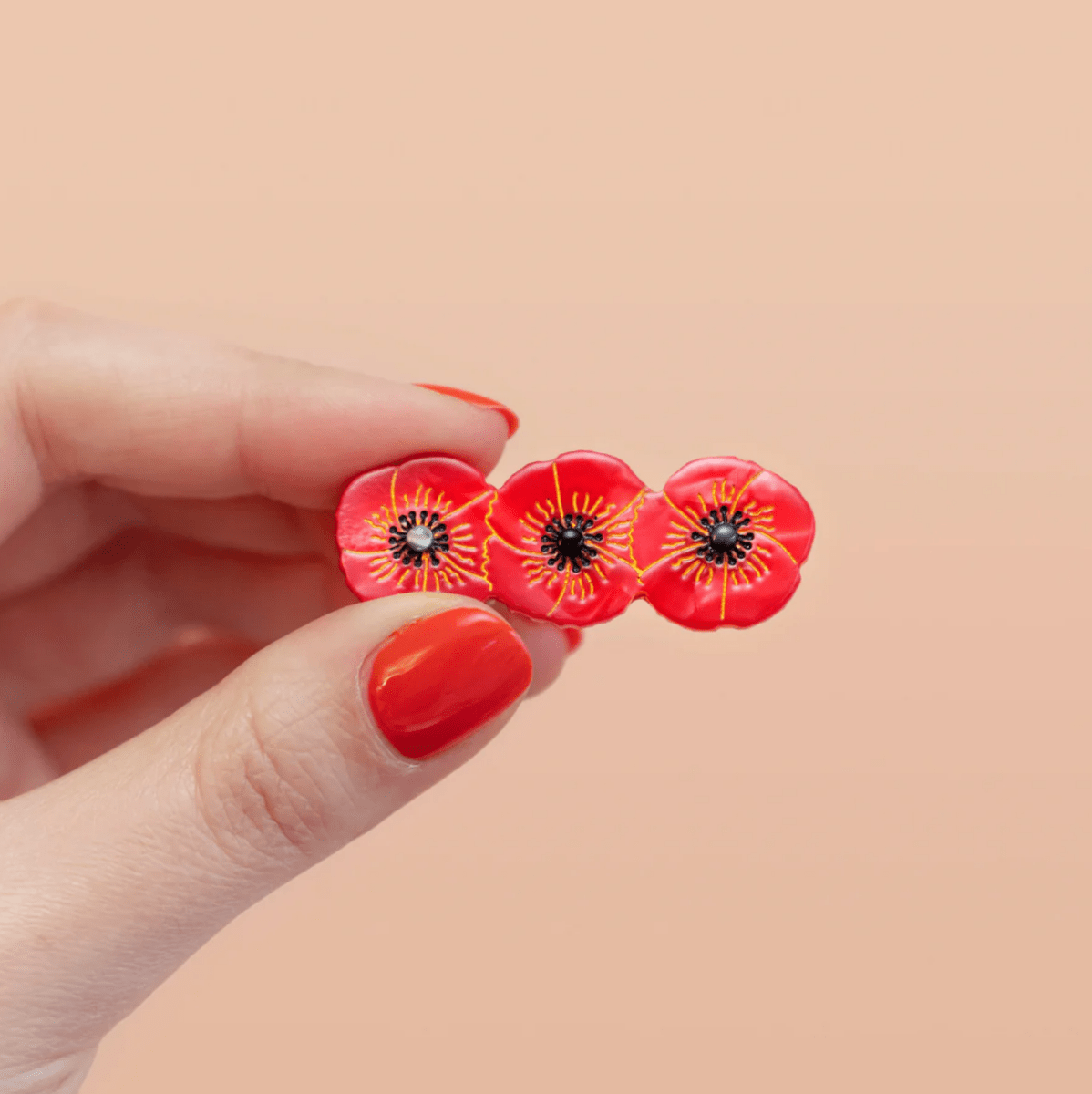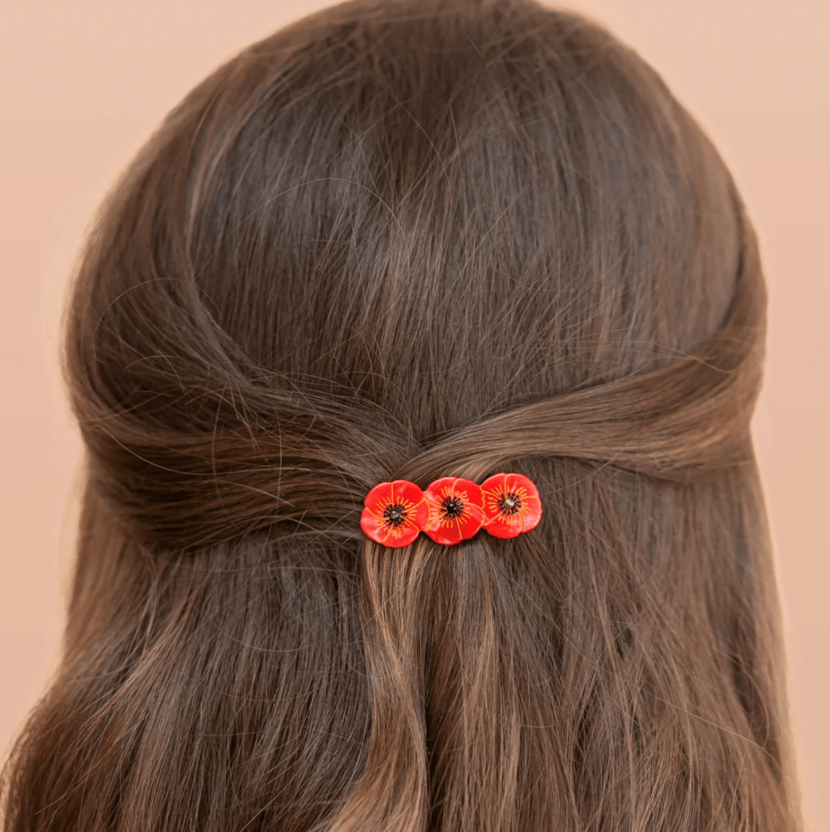 Søt hårspenne med tre røde valmuer. Spennen har tagger som gjør at den sitter godt i håret!