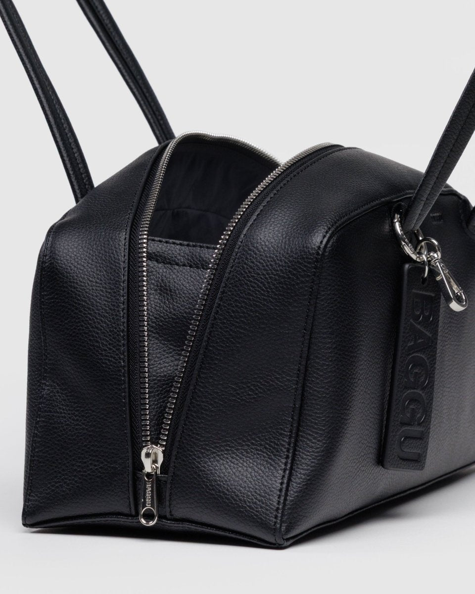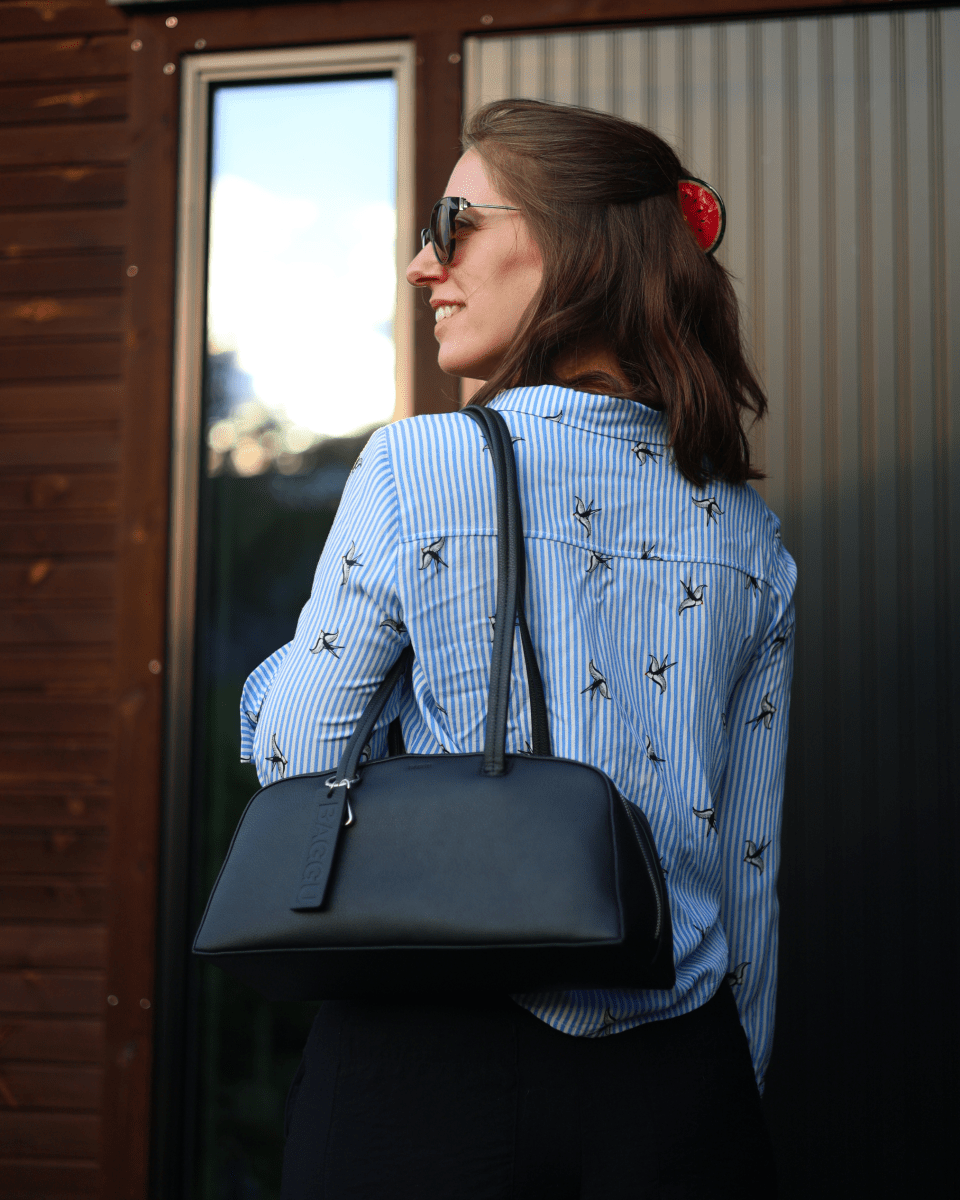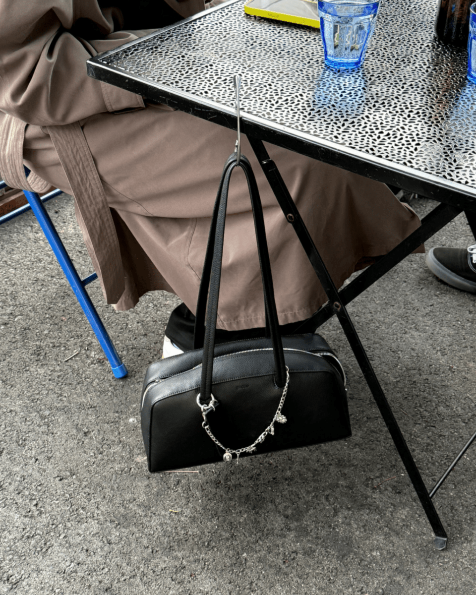 En stilren bowler-veske som inviterer til personalisering med fire charm-hemper og praktisk klipsring. Innvendig glidelåslomme holder verdisakene trygt på plass, mens hovedrommet har plass til bok, mobil, lommebok, nøkler – og litt til.