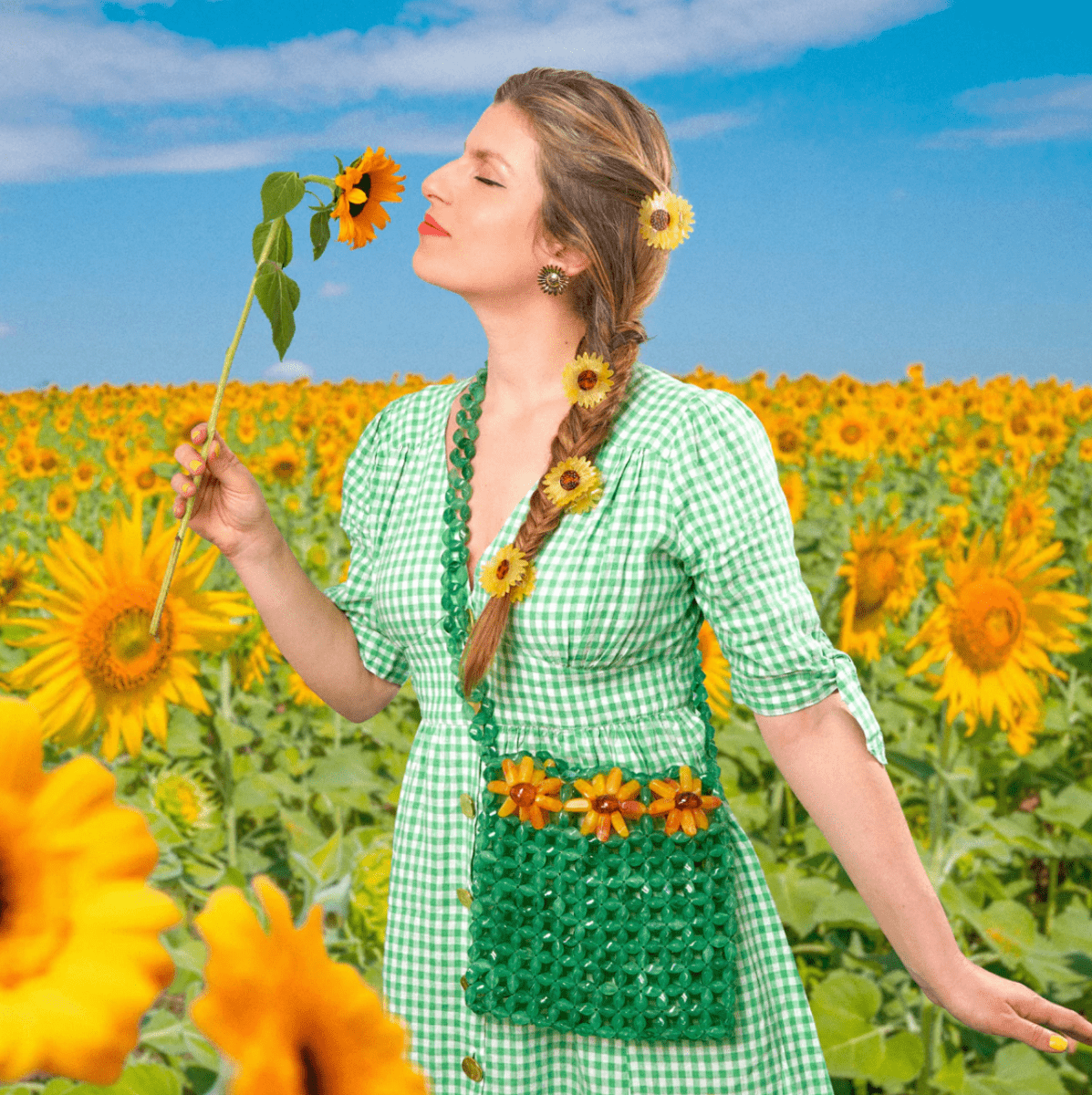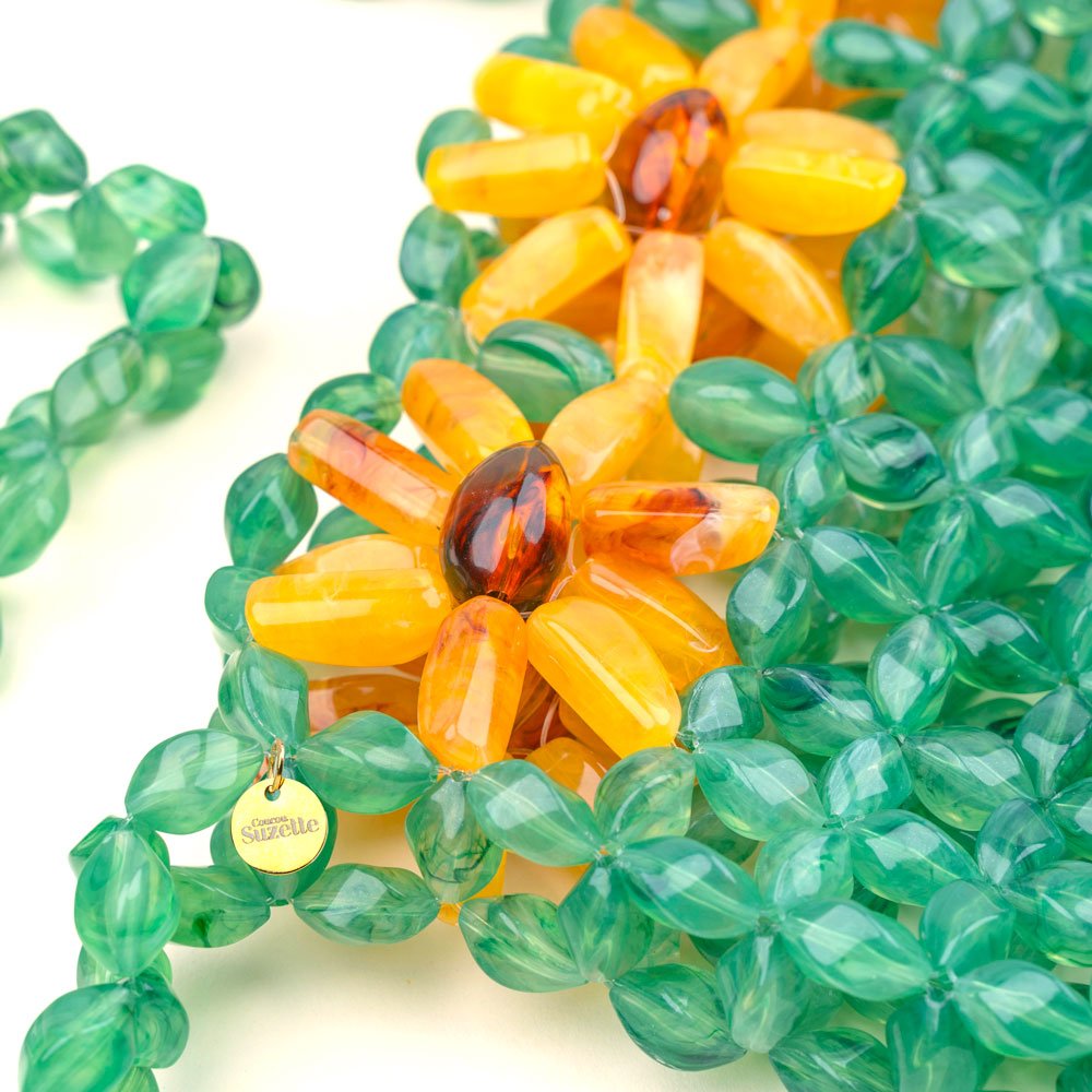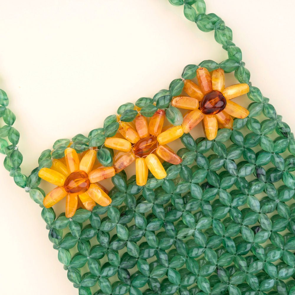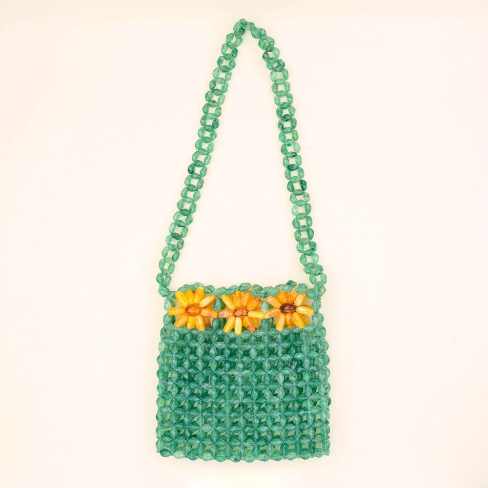 En vakker smaragdgrønn perleveske med en mosaikklignende frise av glade solsikker. Vi elsker dette retroinspirerte tilbehøret – som en skatt du kan glede deg over hele sommeren! En juvel av en veske som løfter ethvert antrekk og sprer glede!