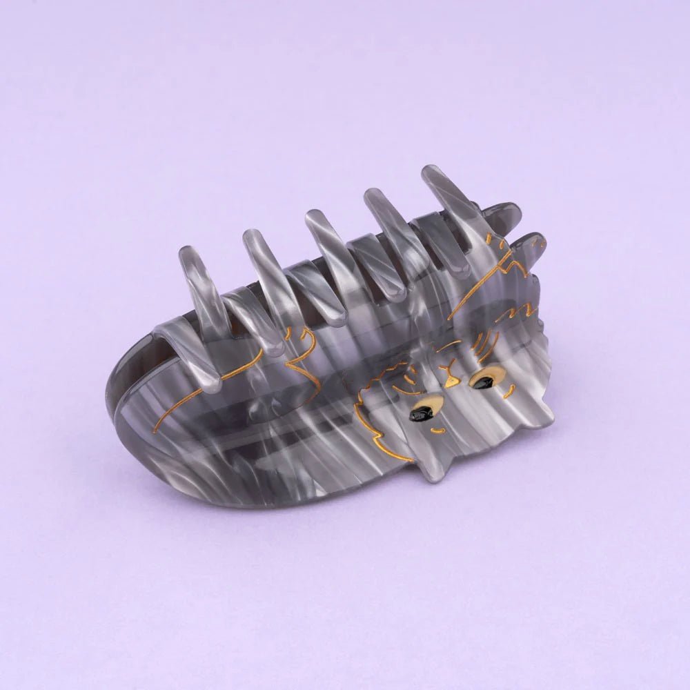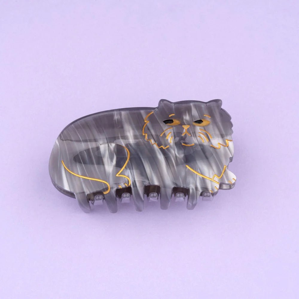 Hårklype formet som en grå/sølvfarget perser med vakre gulldetaljer.
