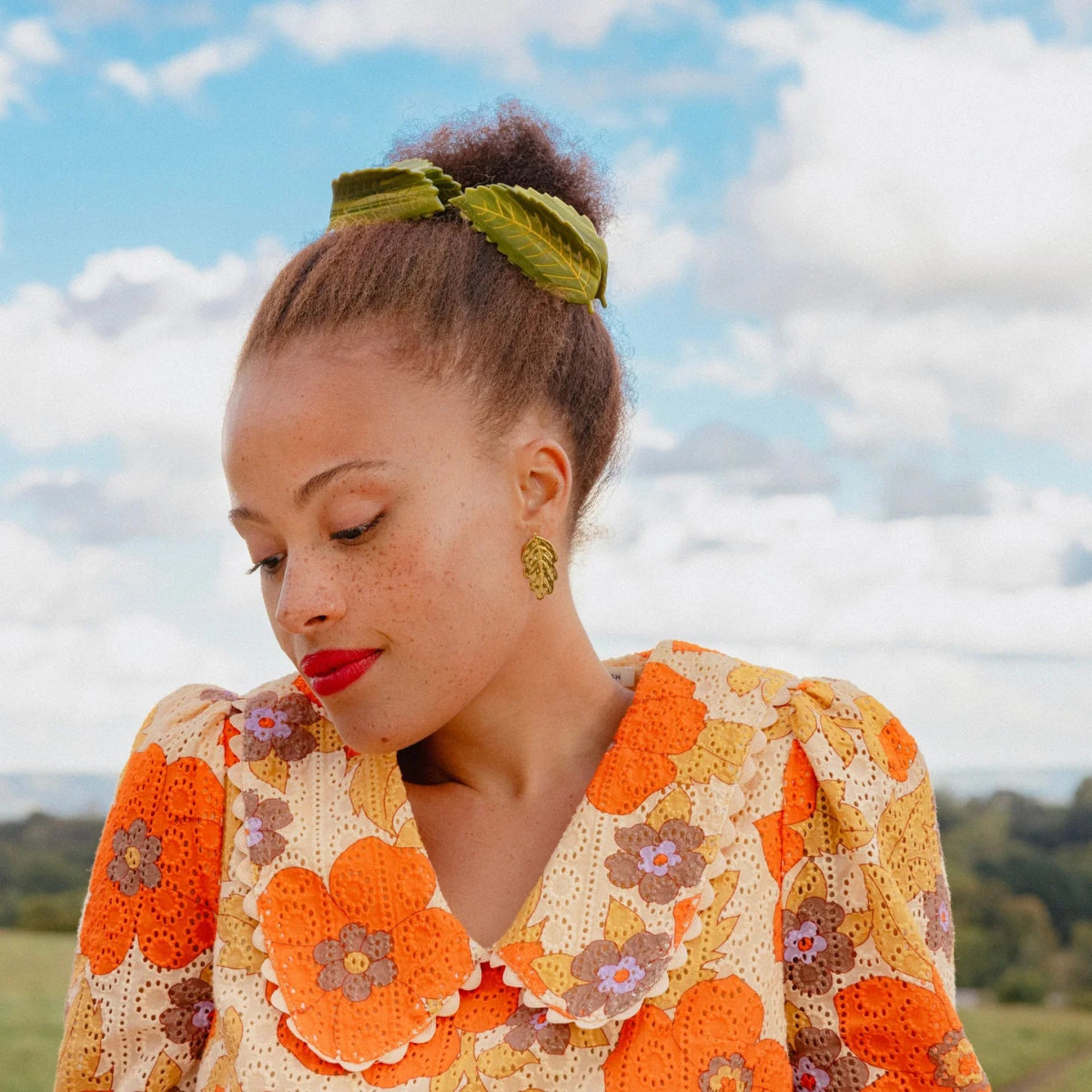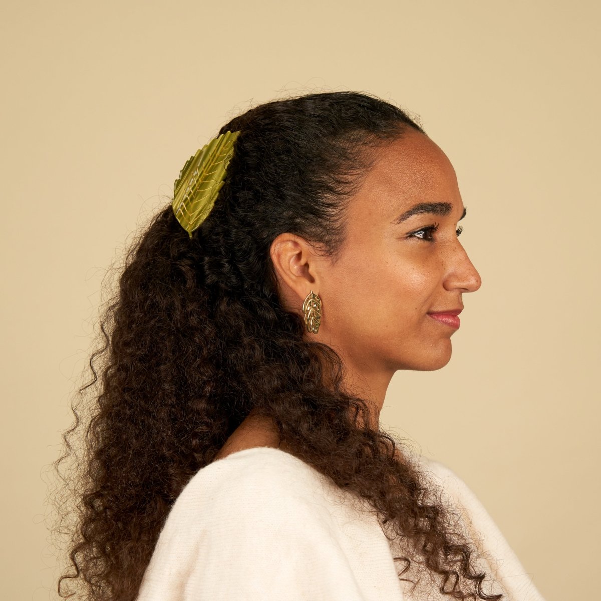 Hårklype formet som et grønt blad med nydelige detaljer i gull.
