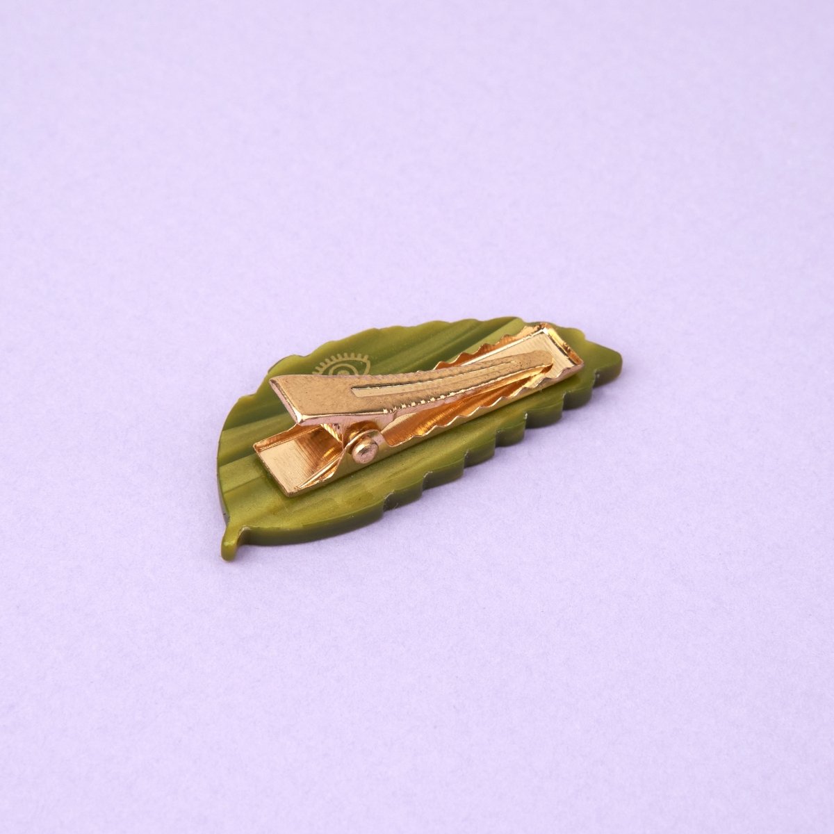 Hårspenne med et grønt blad. Spennen har tagger som gjør at den sitter godt i håret!