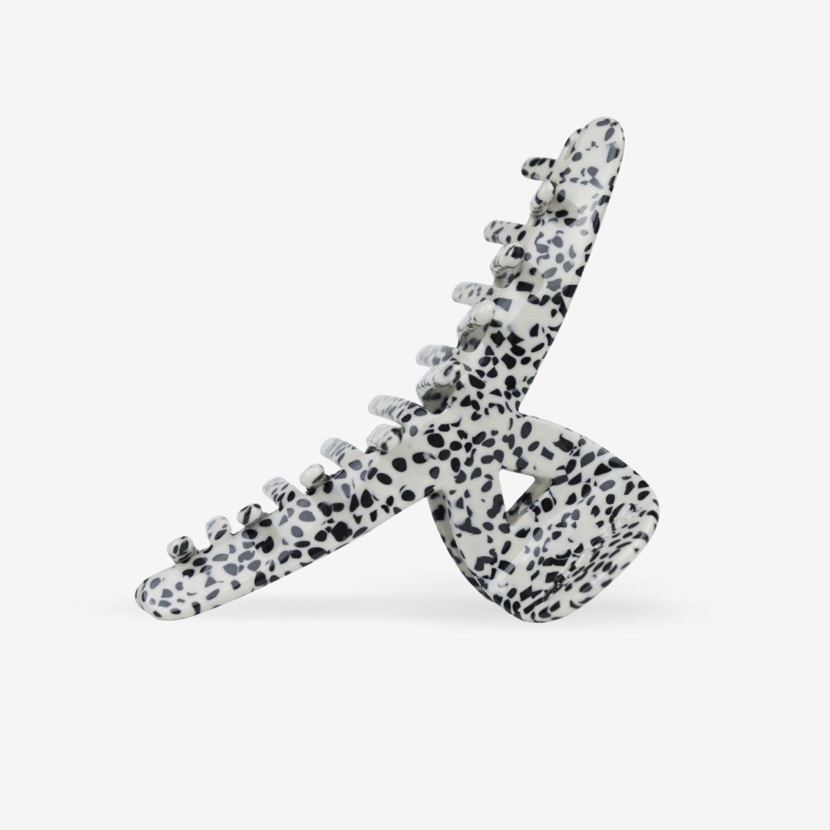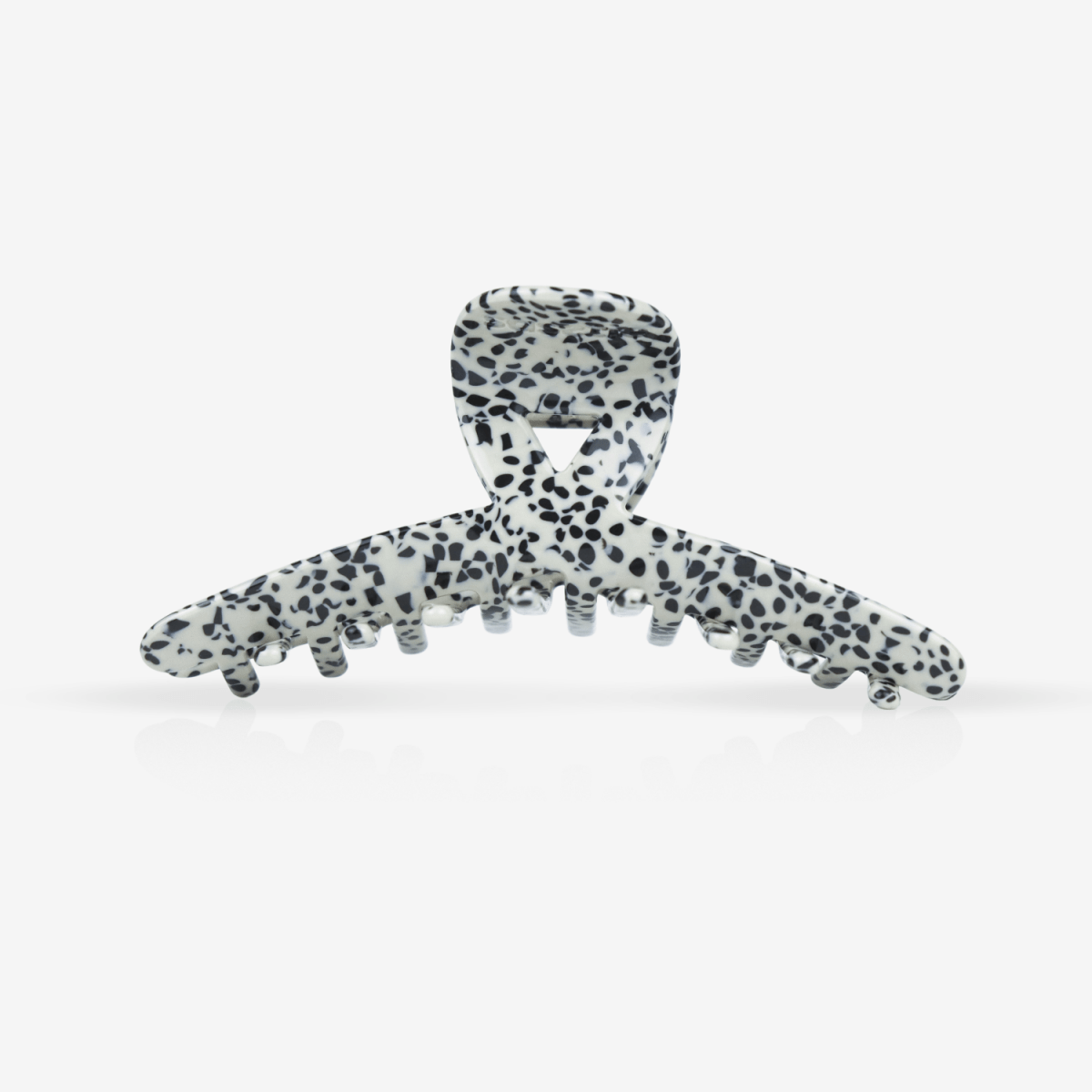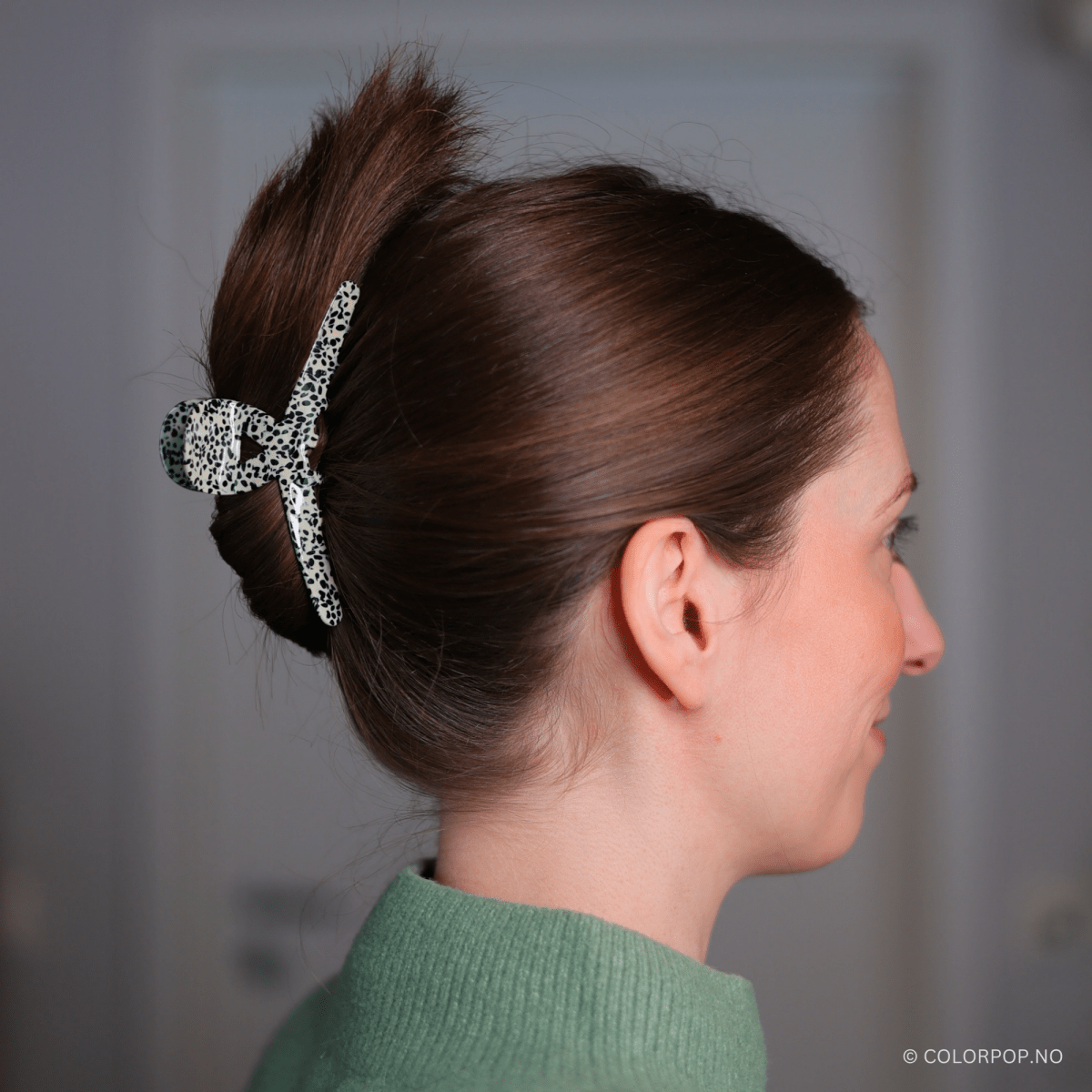 Hårklype som sitter komfortabelt inntil hodet pga bueformen og veier lite. Gråhvit med sorte prikker og passer til nesten alt.