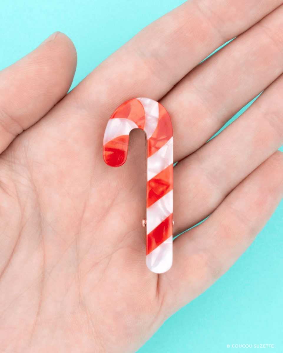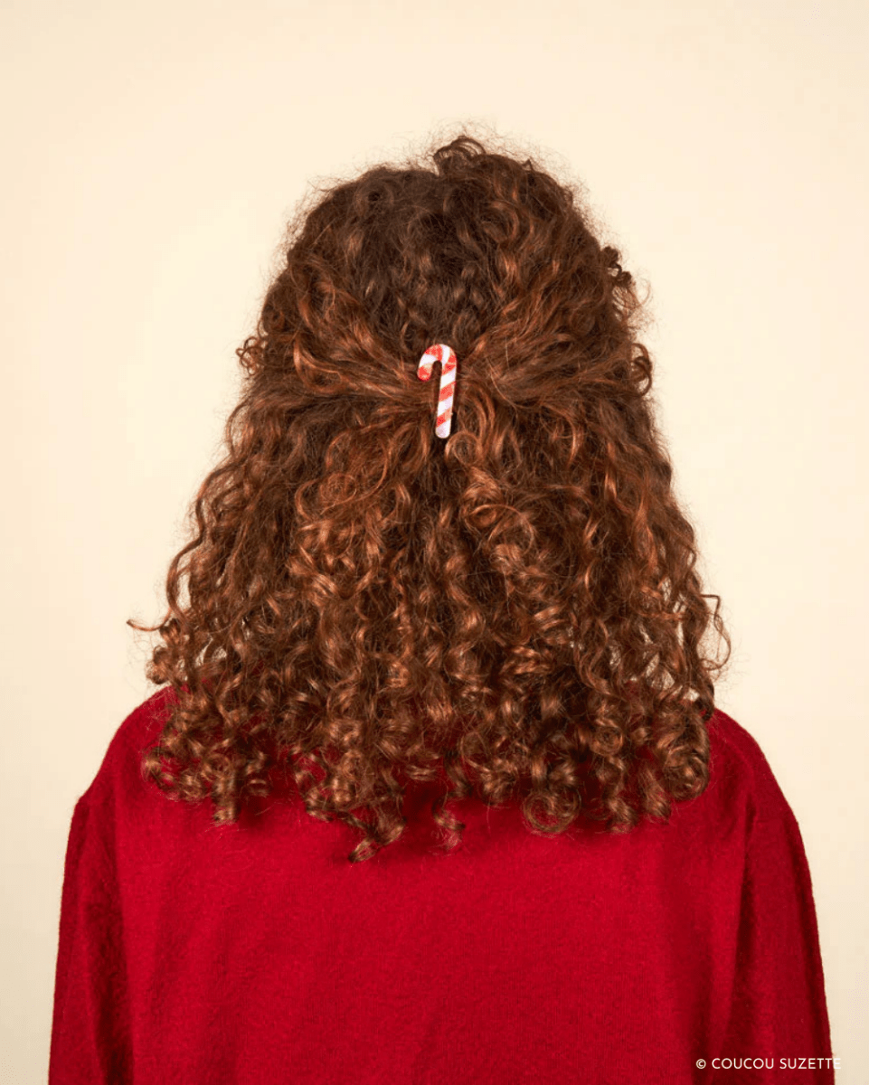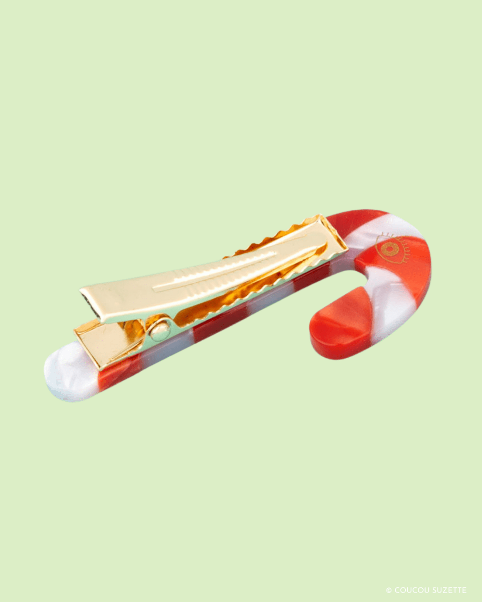Hårspenne i form av en rød og hvit sukkerstang fra Coucou Suzette™. Spennen har tagger som gjør at den sitter godt i håret!
