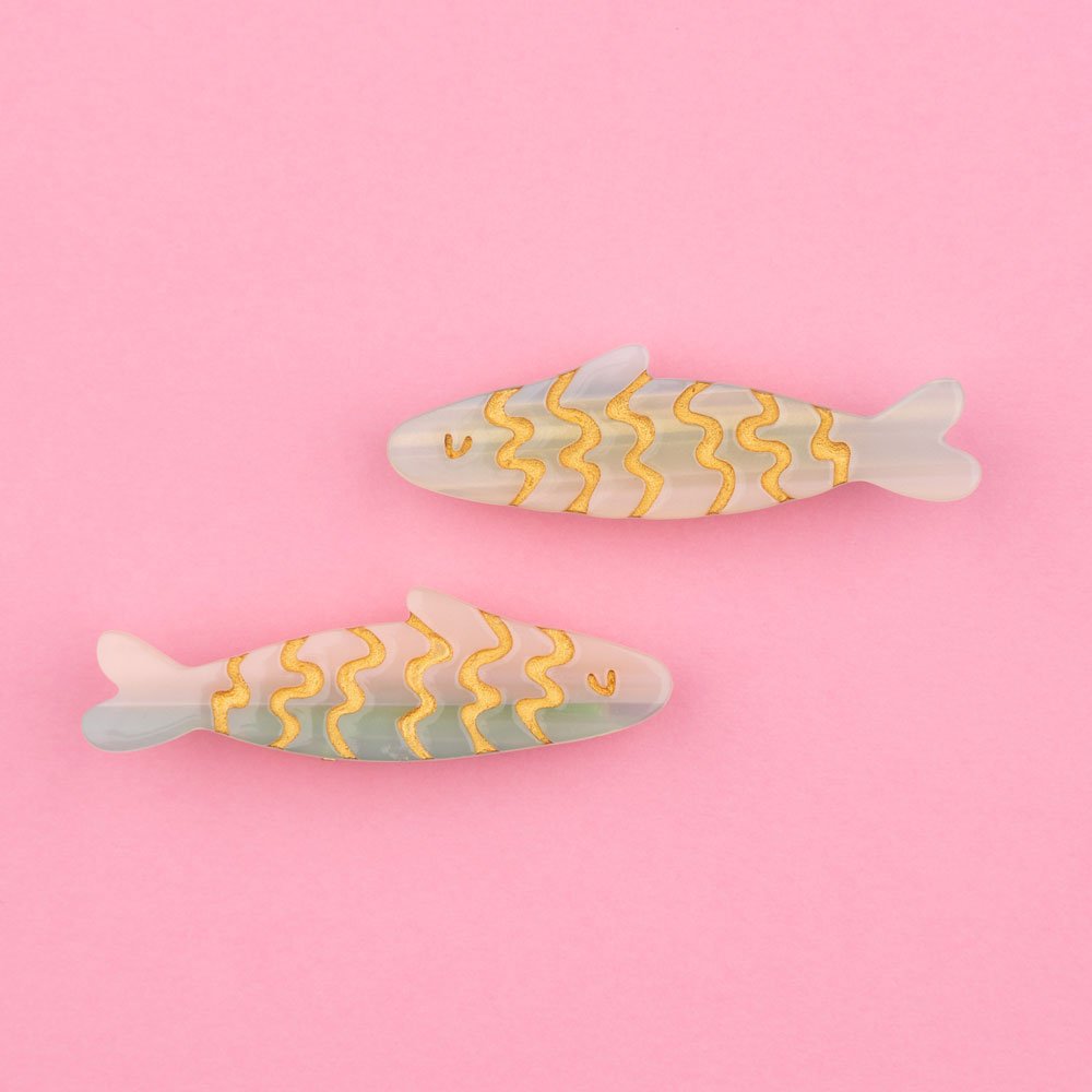 2 stk hårspenner med sardiner. De vi har inne nå har to ulike grønnfarger, men farger kan variere i sjattering. Spennene har tagger som gjør at de sitter godt i håret!