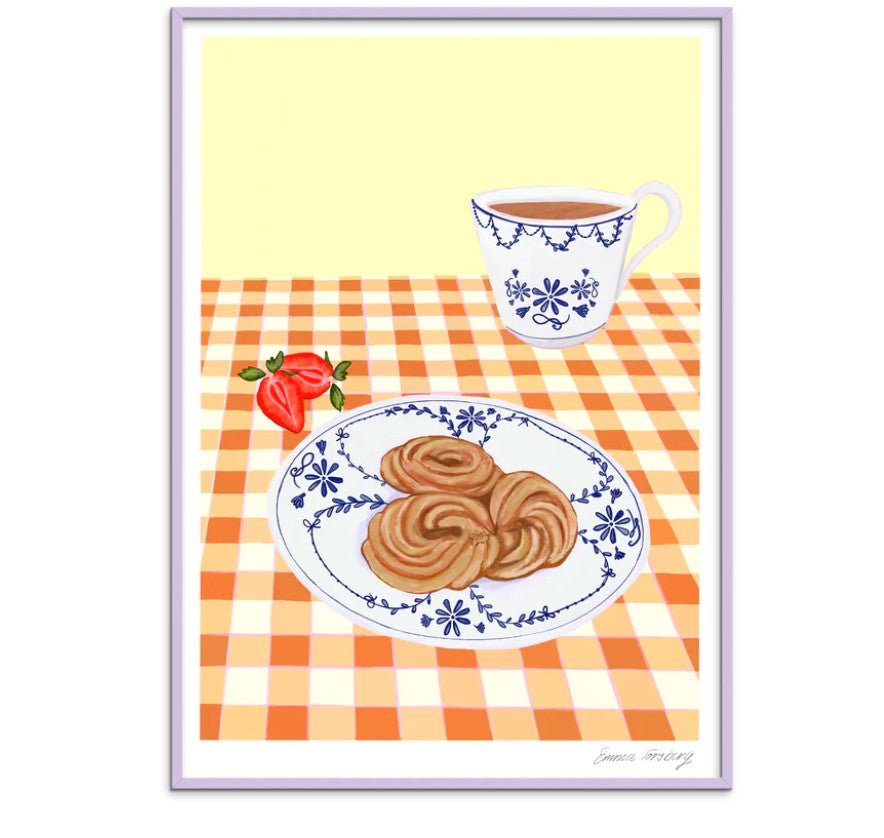 Print av kunstneren Emma Forsberg. Koselig motiv av en kaffepause med noe godt og en nostalgisk duk og servise.