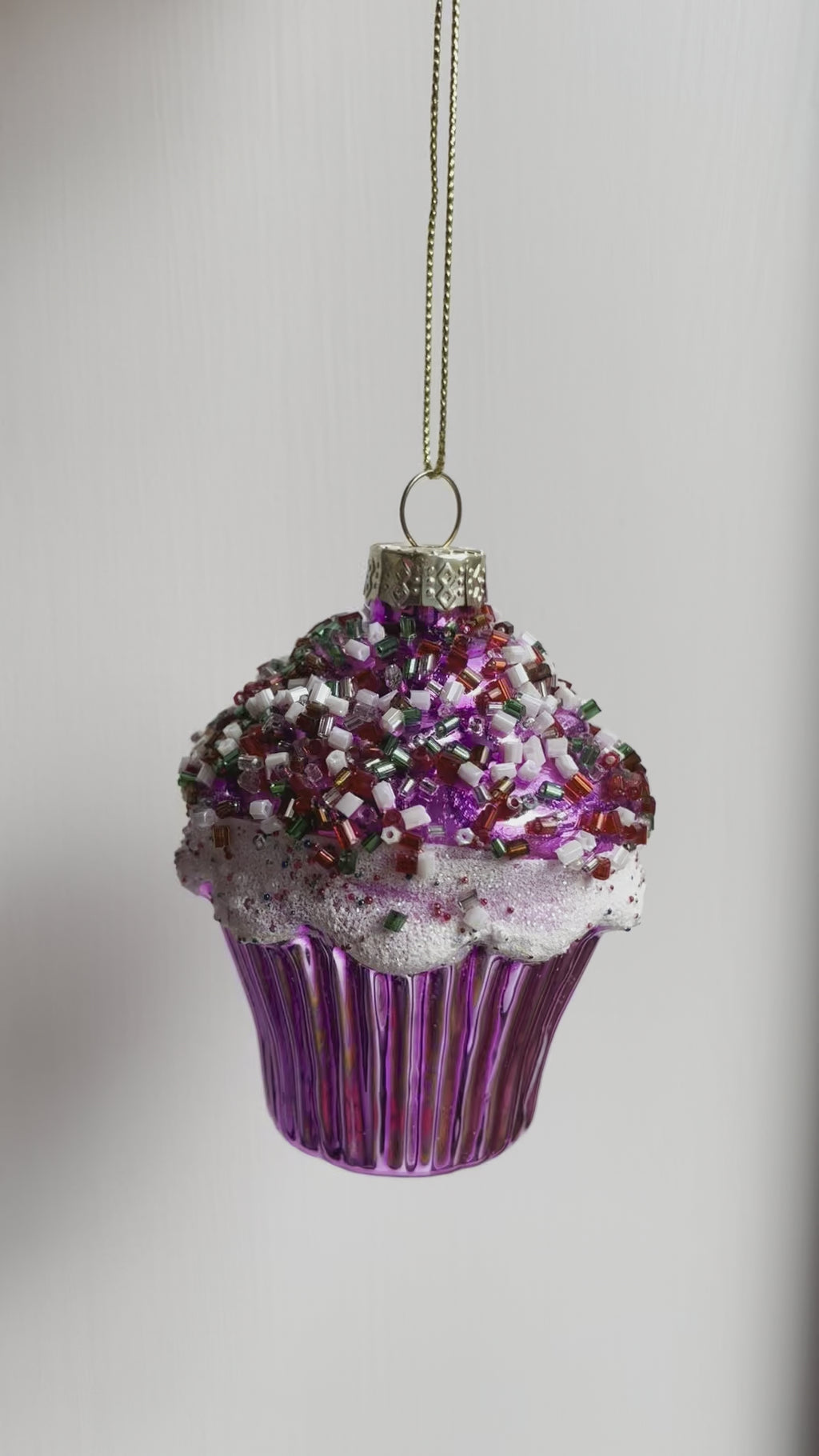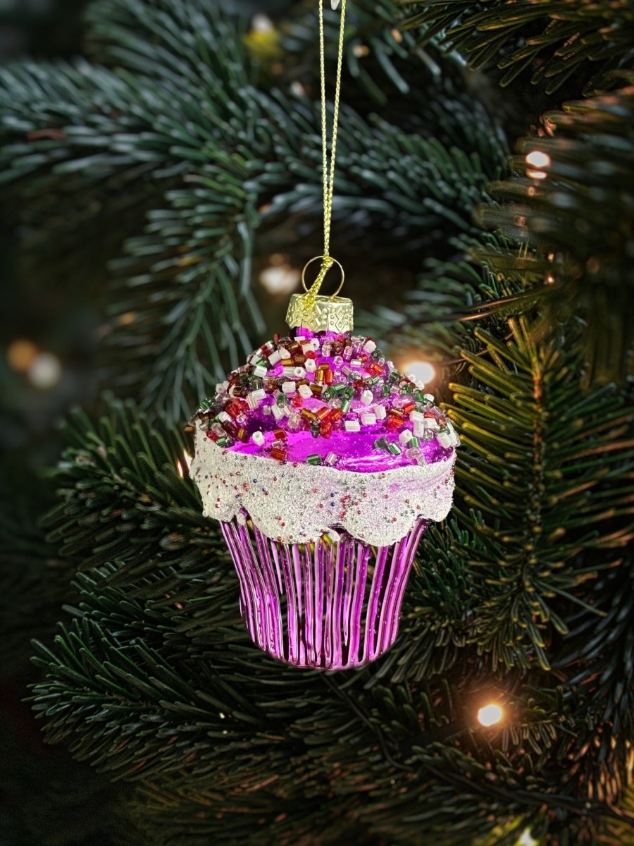 Pynt juletreet ditt med denne festlige glasskulen formet som en muffins.