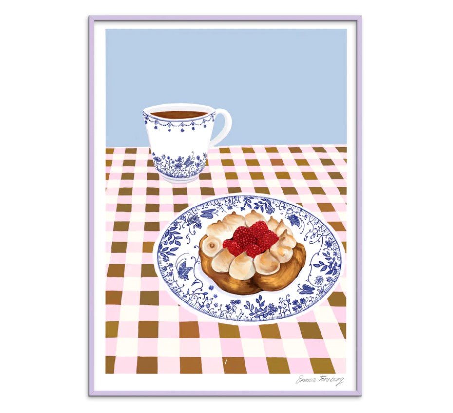 Plakat av kunstneren Emma Forsberg. Koselig motiv av en kaffepause med noe godt og en nostalgisk duk og servise.