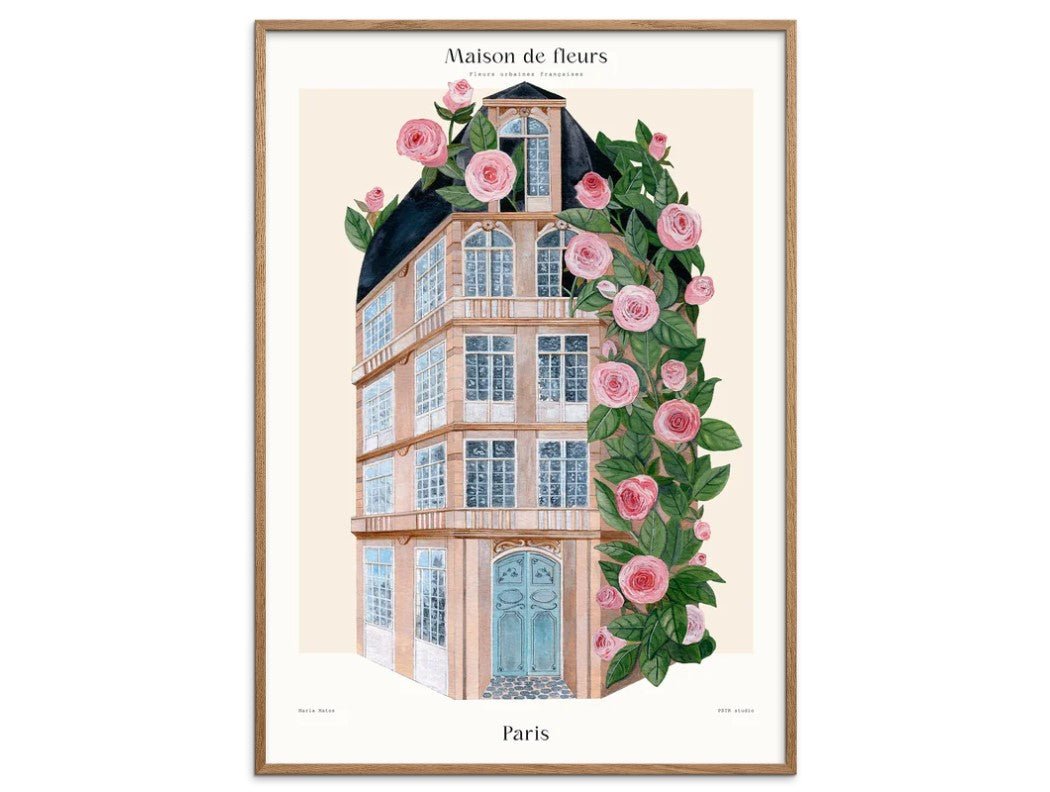 Romantikk i Paris med roser klatrende på en bygård. Fra kunstneren Maria Matos.