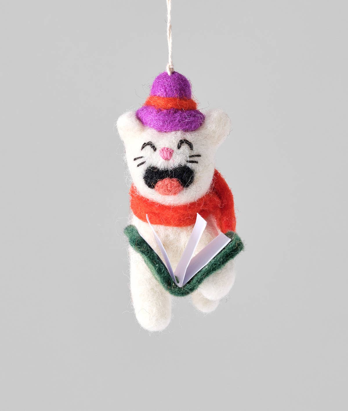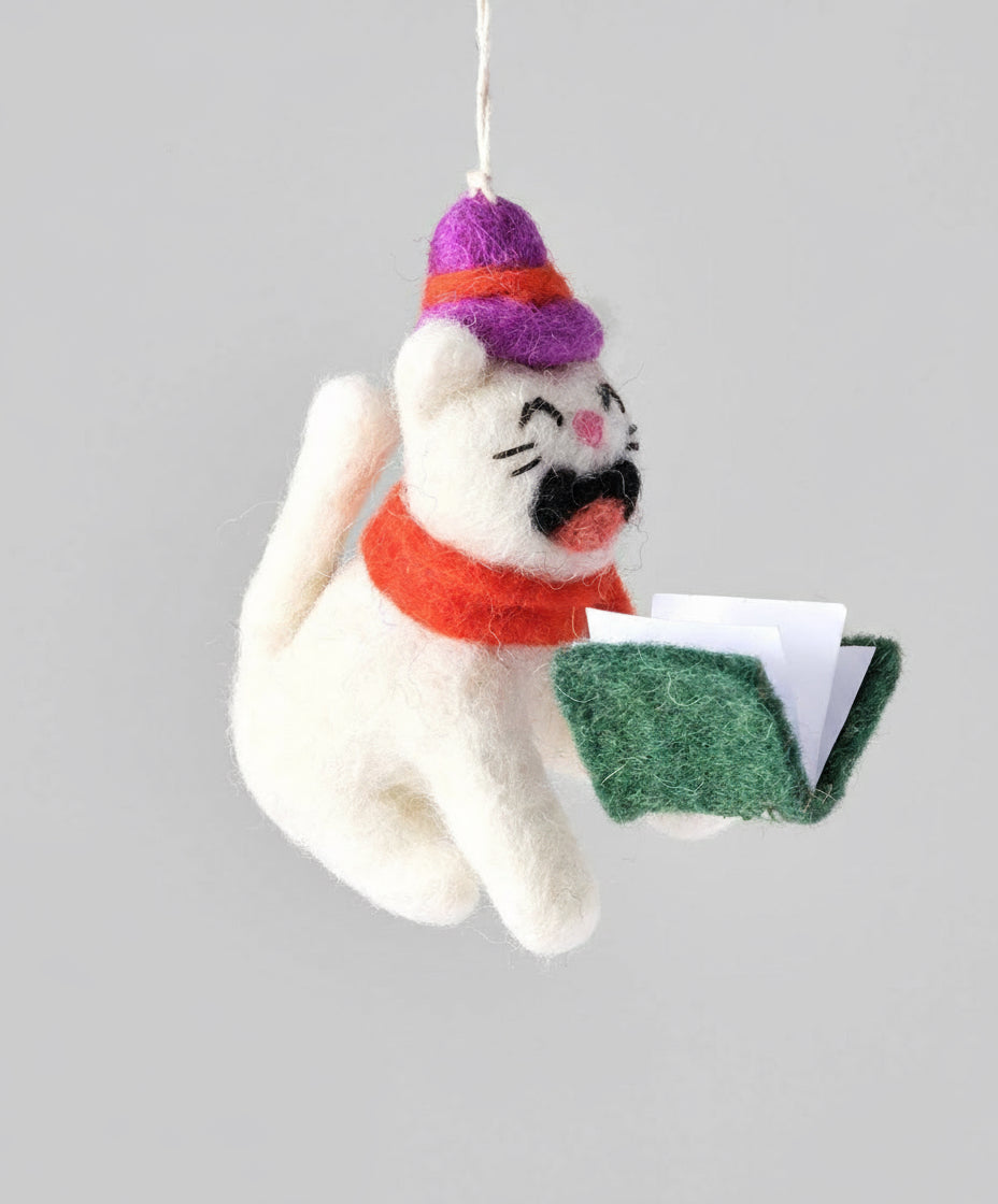 Carolling Cat er en sjarmerende julepynt - en katt som synger julen inn, med en bok som kan åpnes.