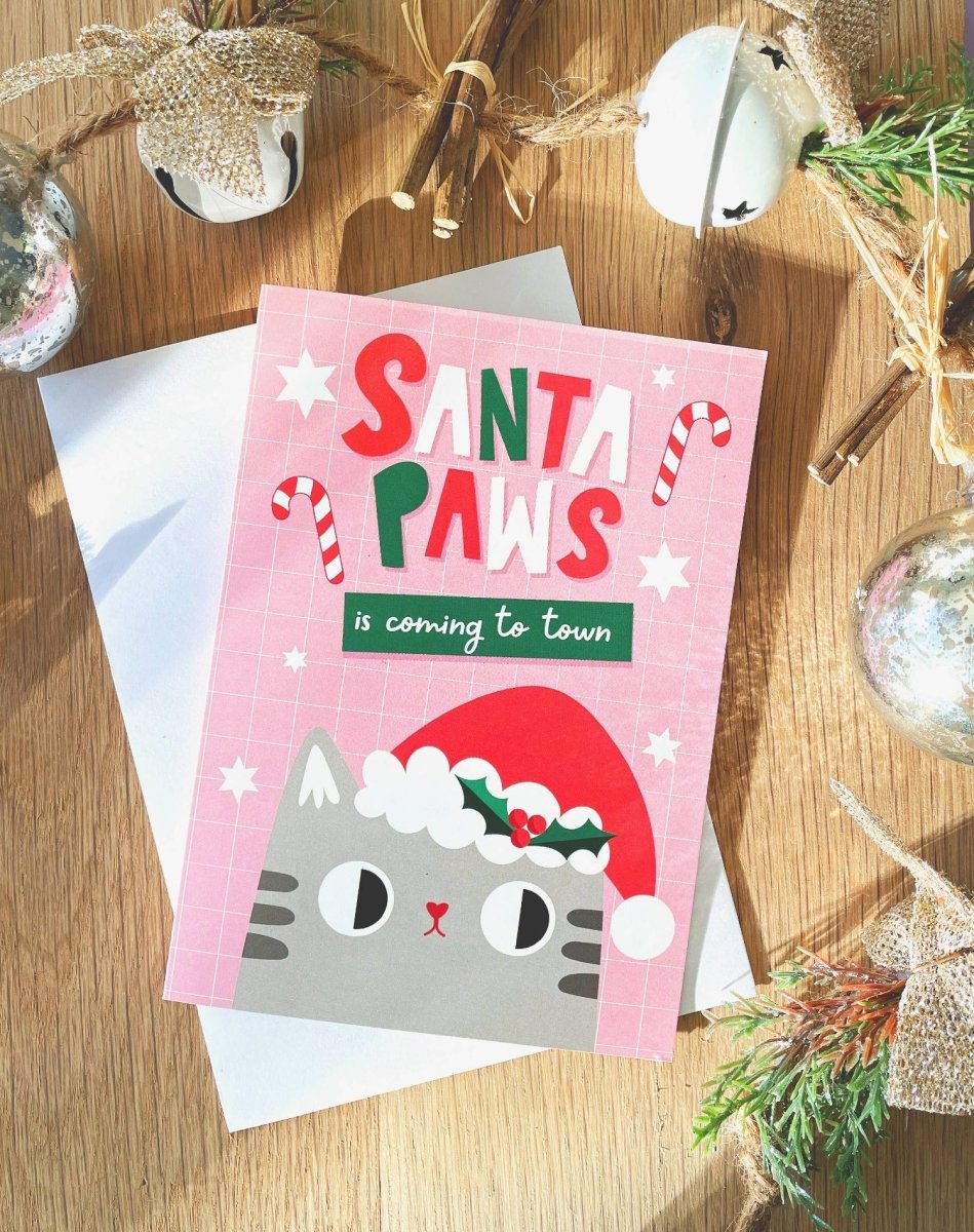 3-pakning med søte doble julekort med katter. Innsiden av kortet har teksten: Meowy Christmas og bilde av kristtorn.