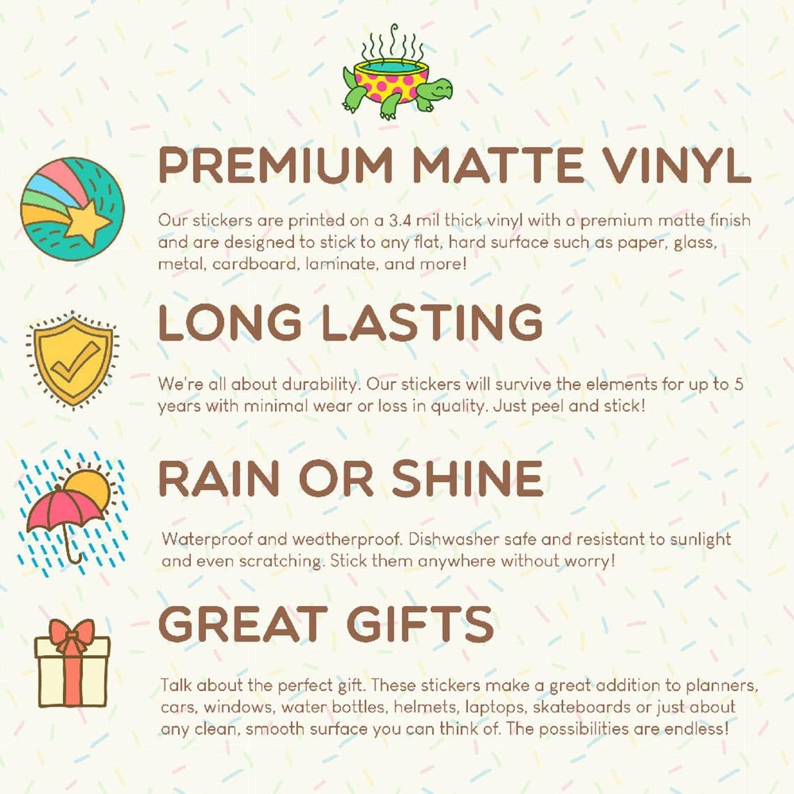 De er UV-belagte, noe som sikrer at de ikke falmer i sollyset, og de tåler til og med en runde i oppvaskmaskinen! Det gjør dem perfekte for kreativ dekorasjon på vannflasker, skateboard, mobildeksler, permer, bøker, laptop, postkasse, sykkelhjelmer, kofferter som kjennetegn, matbokser, og mer.