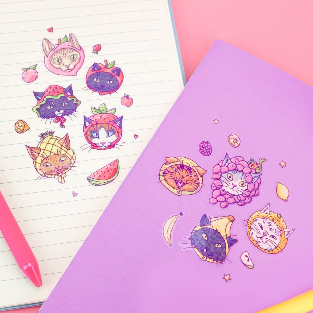 'Fruit Hat Cats' klistremerkeark 🐢 Arket er 10 cm x 15 cm og inkluderer ett (1) ark per pakke, med 10-20 individuelle vanntette vinylklistremerker.