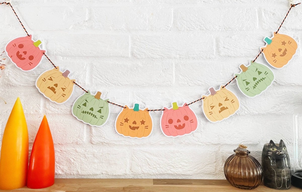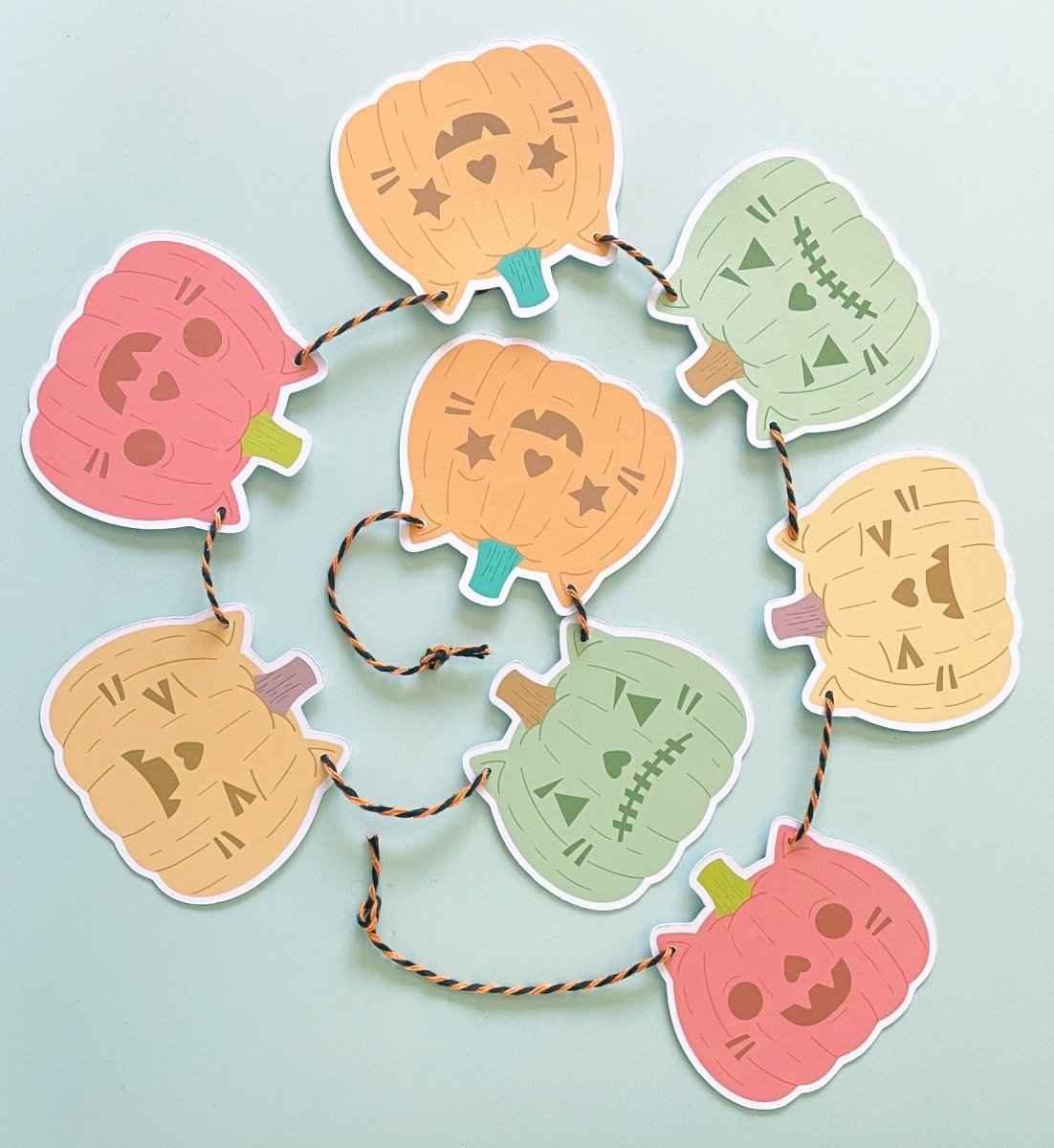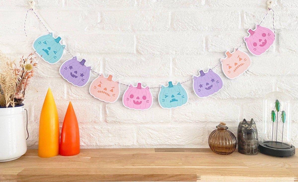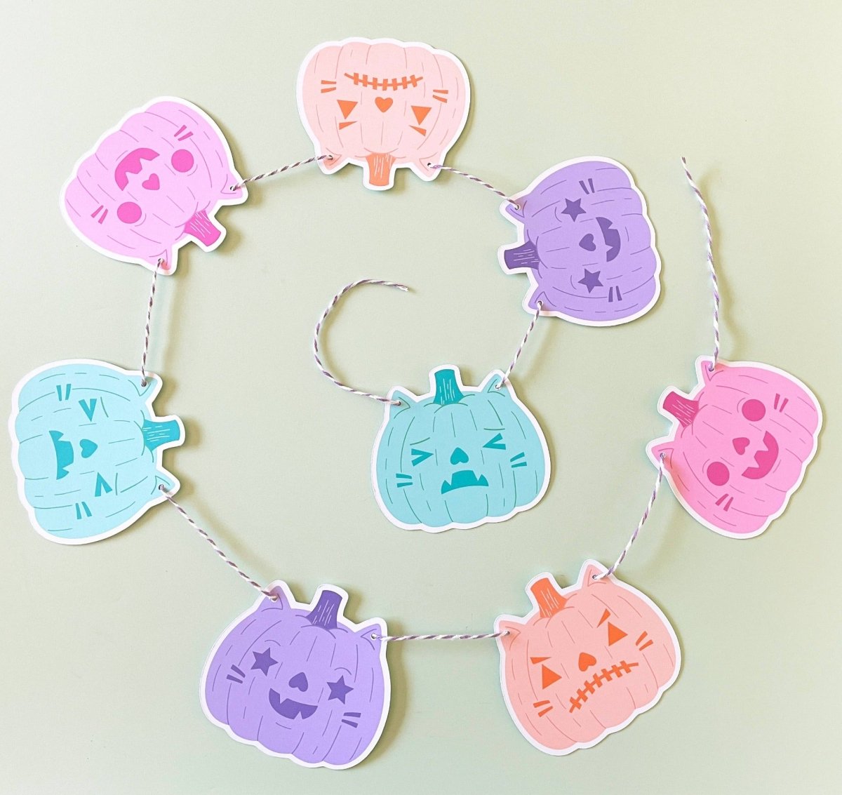 Den søteste halloween-dekorlenken tilgjengelig i 2 fargevarianter - klassisk halloween (oransje, grønn, gul, rød) og pastell halloween (rosa, turkis, lilla).