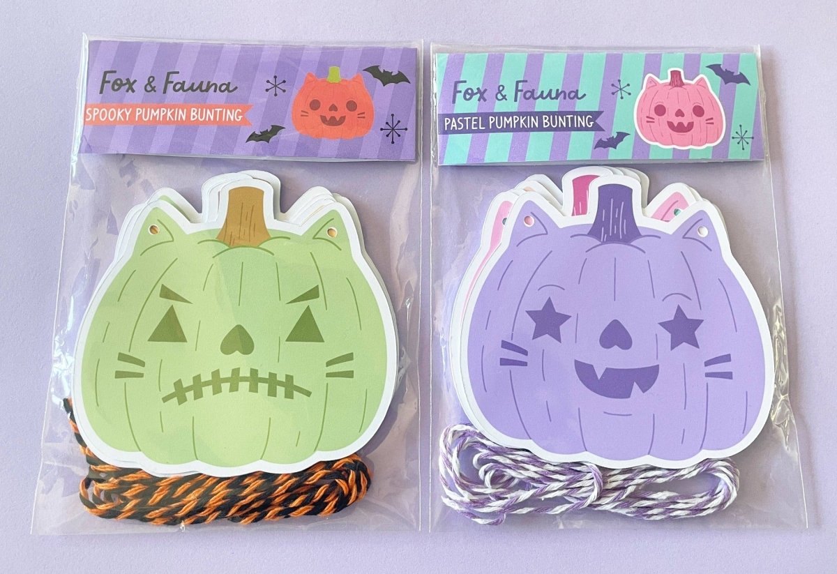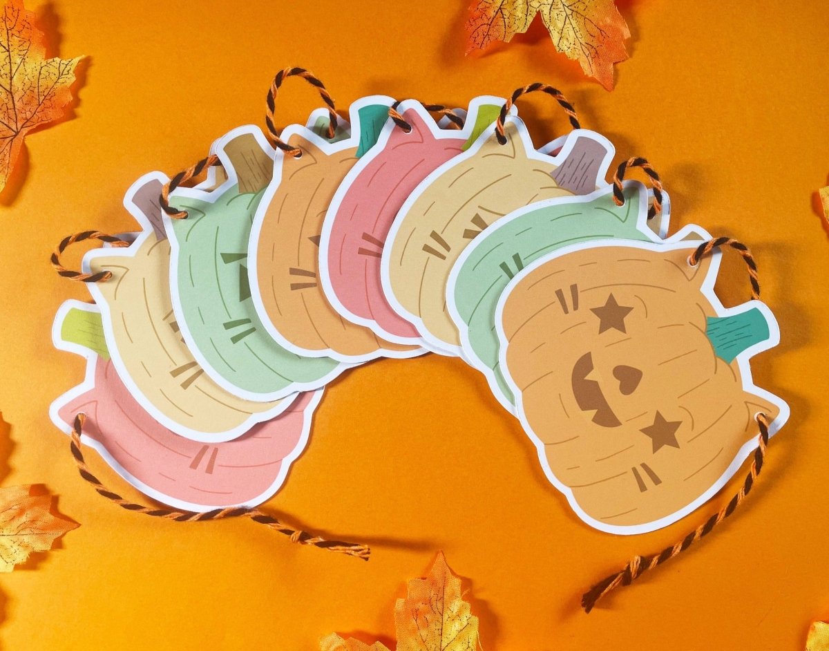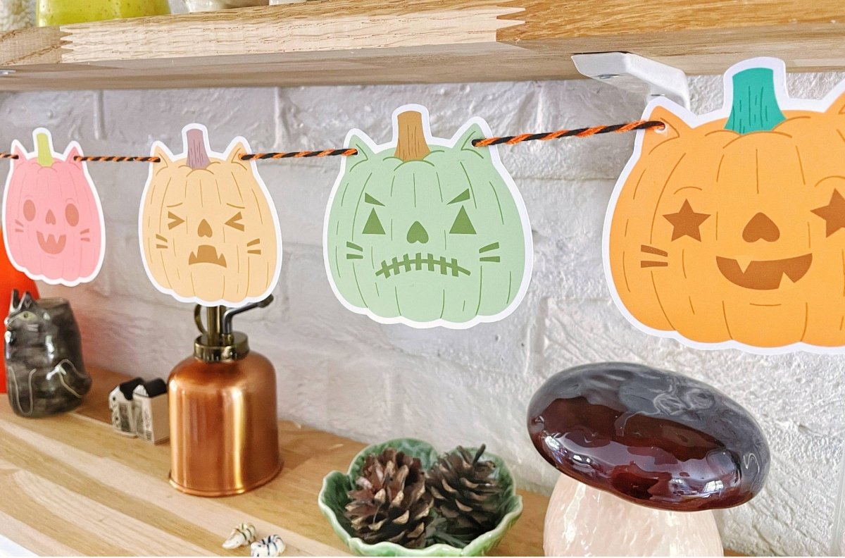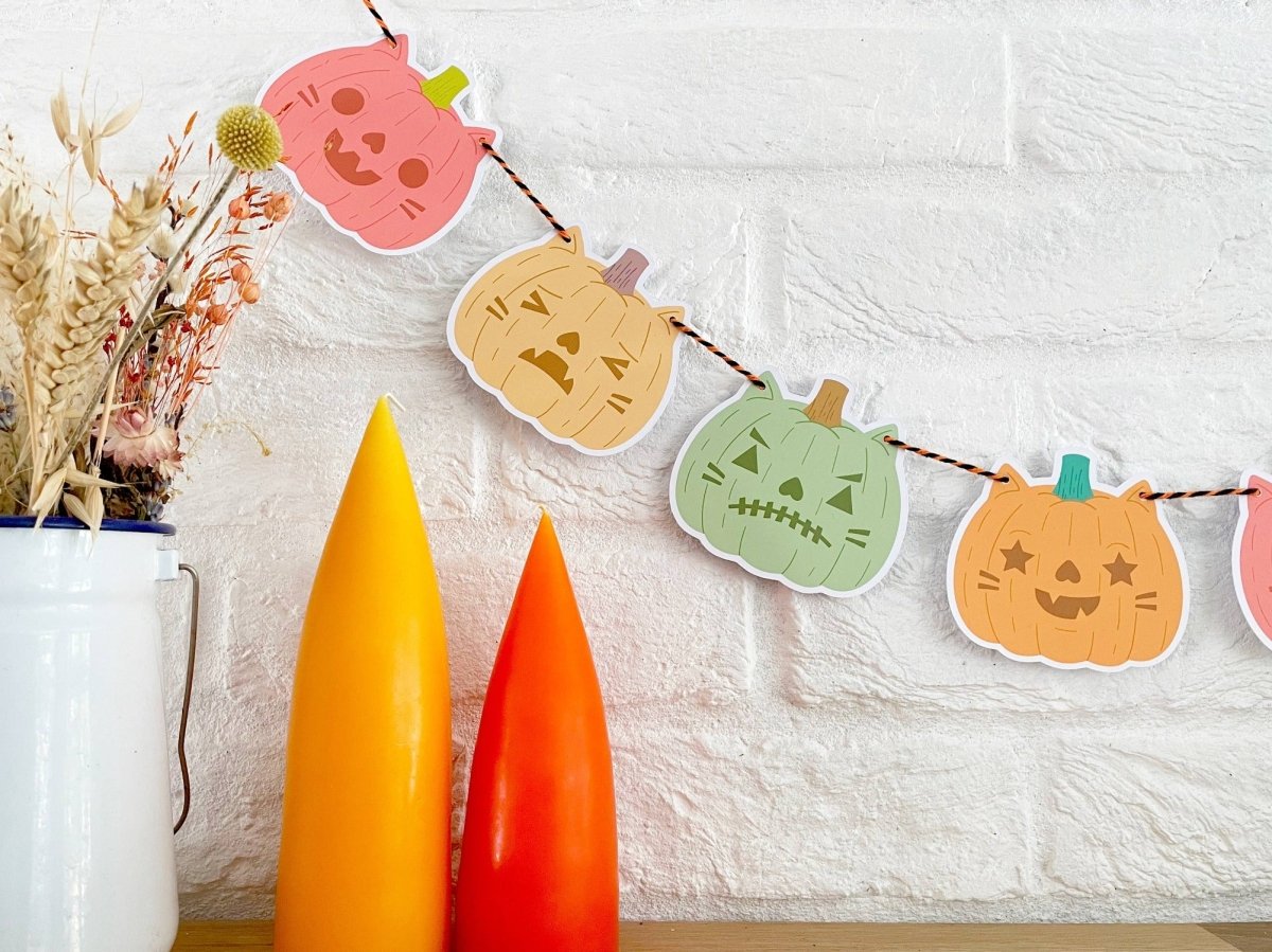Den søteste halloween-dekorlenken tilgjengelig i 2 fargevarianter - klassisk halloween (oransje, grønn, gul, rød) og pastell halloween (rosa, turkis, lilla).