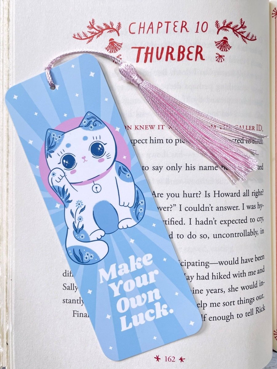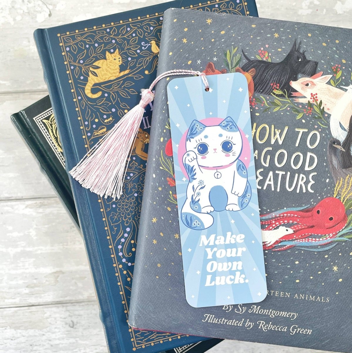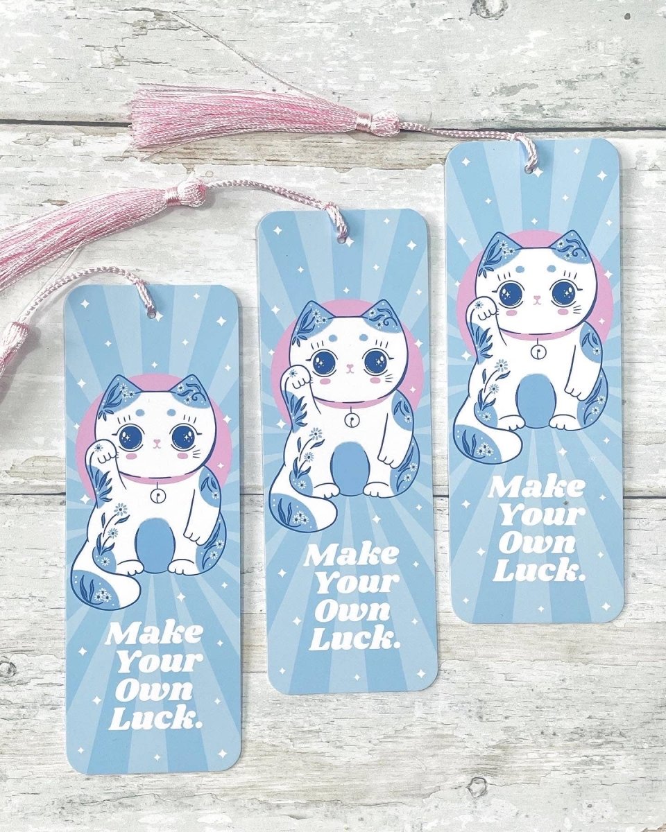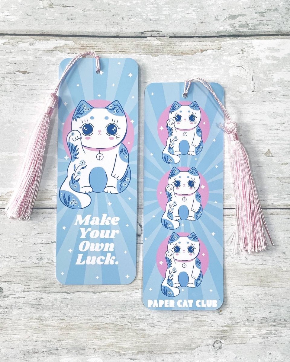 Dette dobbeltsidige bokmerket med rosa dusk har den søteste lille vinke-katten som skal bringe lykke. Trykt på resirkulert tykt 350 g/m2 papir med matt laminat for å holde det vakkert.