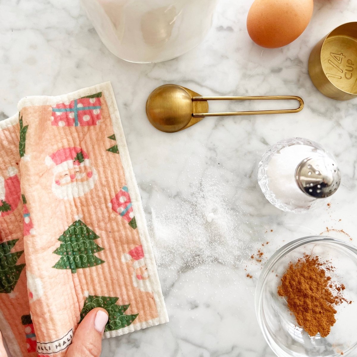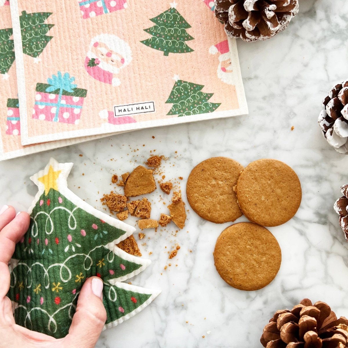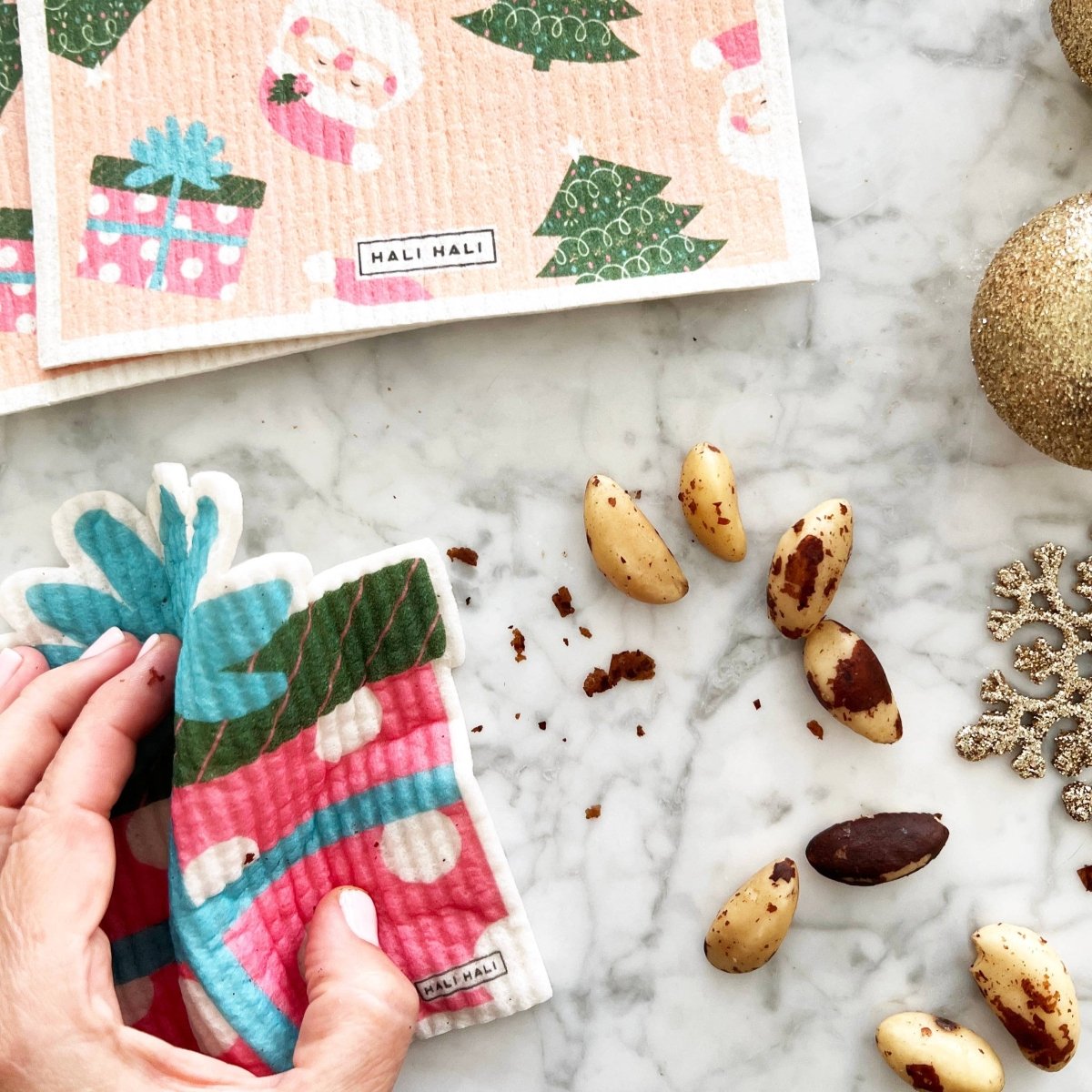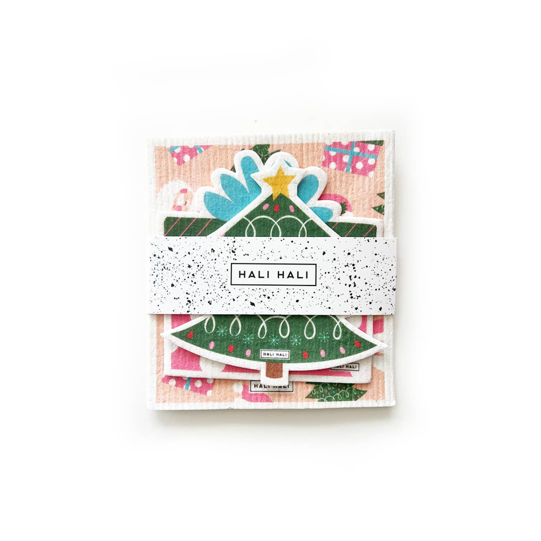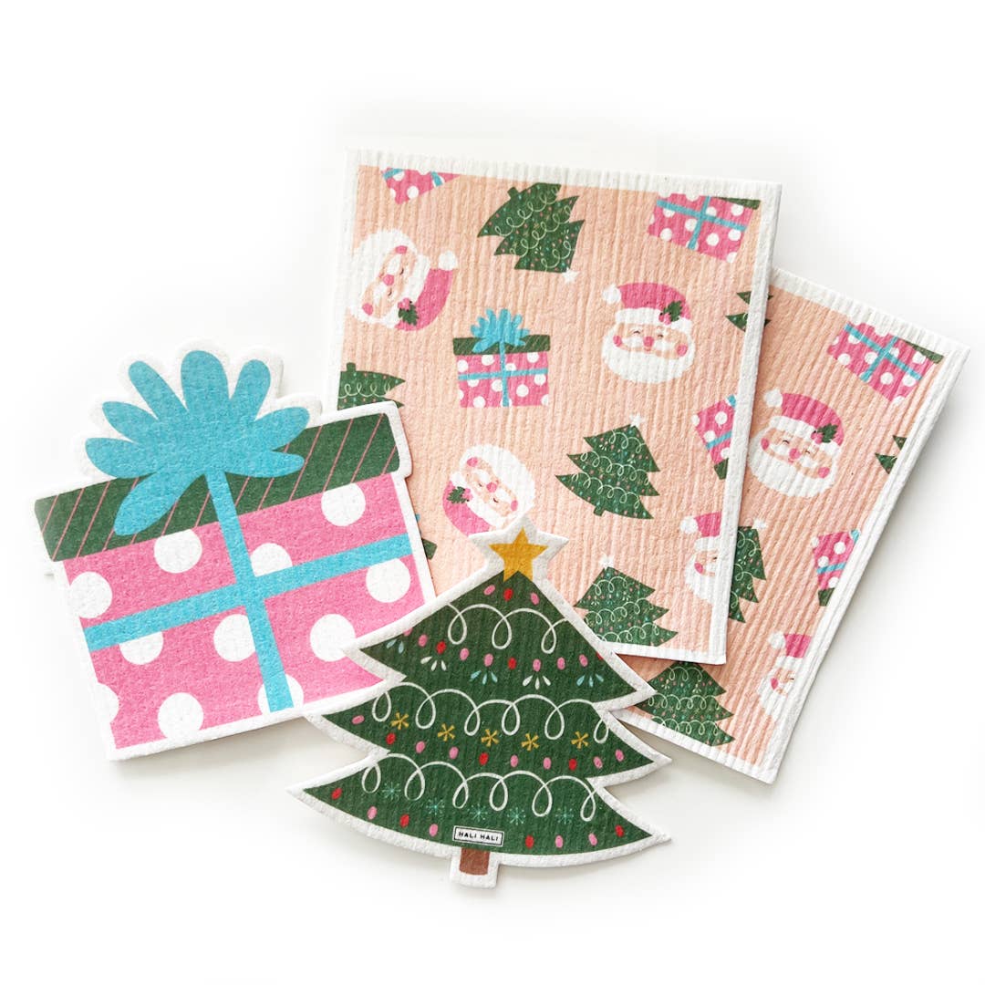 Gjør rengjøringen mer fargerik og bærekraftig med våre gjenbrukbare svampekluter. Dette julesettet har 2 stk firkantede kluter med julemotiv, 1 klut formet som et juletre, og 1 klut formet som en julegave.