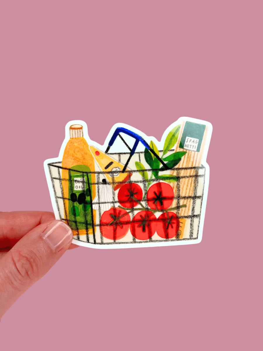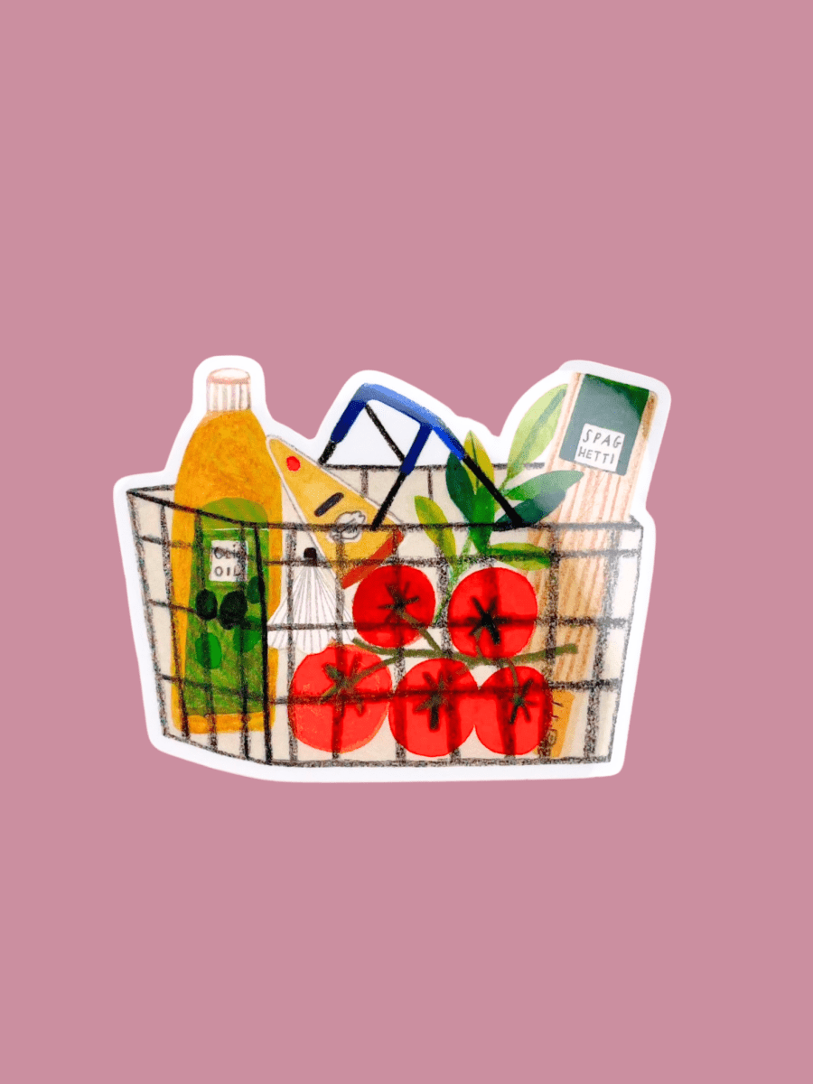 Et klistremerke av en handlekurv fylt med ingredienser til spagetti.