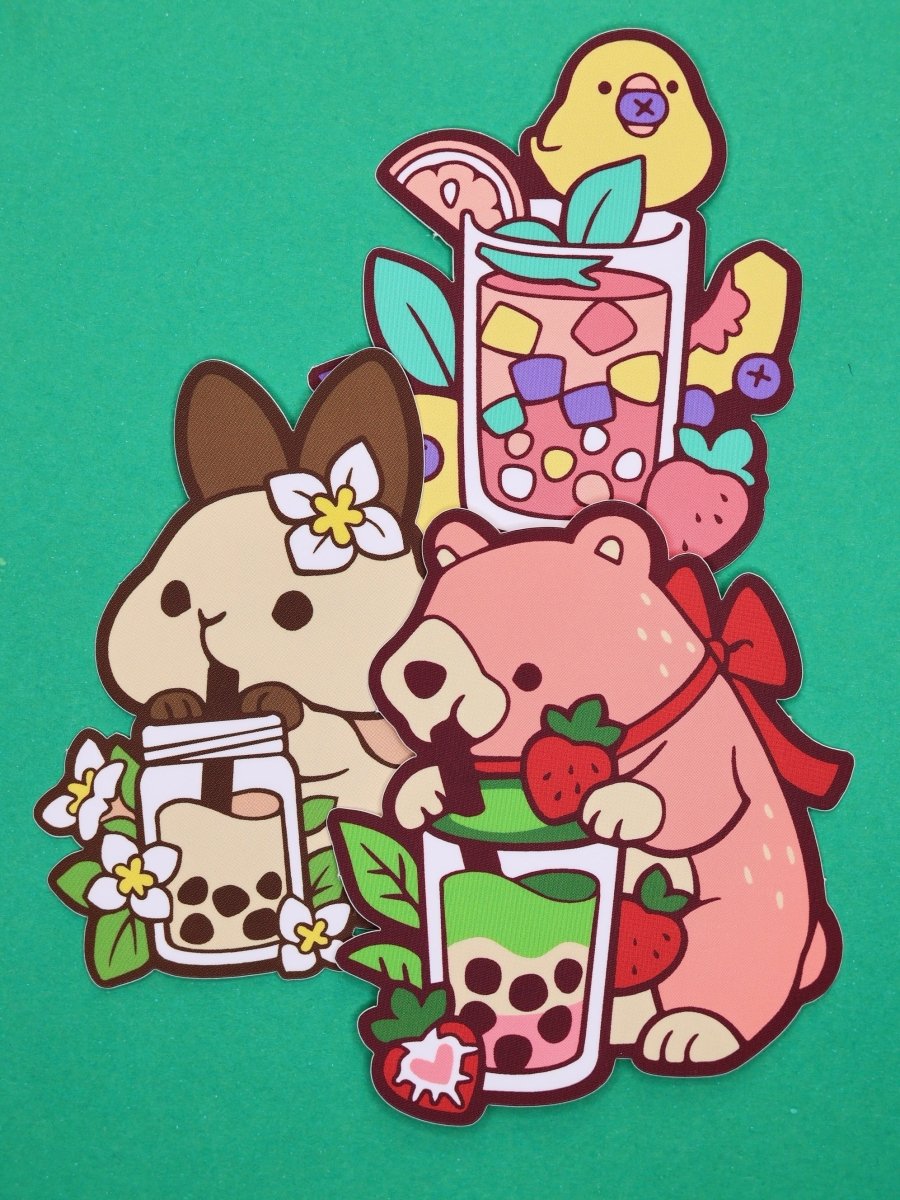 Et søtt klistremerke av en bjørn som drikker jordbær og matcha bubble tea. Perfekt klistremerke for å pynte opp vannflasker, postkasse, laptop, mobildeksler, permer, kofferten som kjennetegn, med mer! 🌟💖