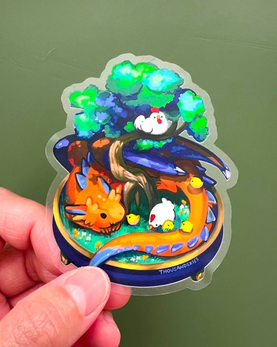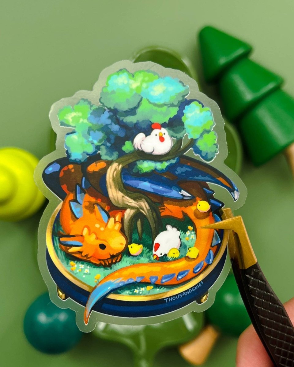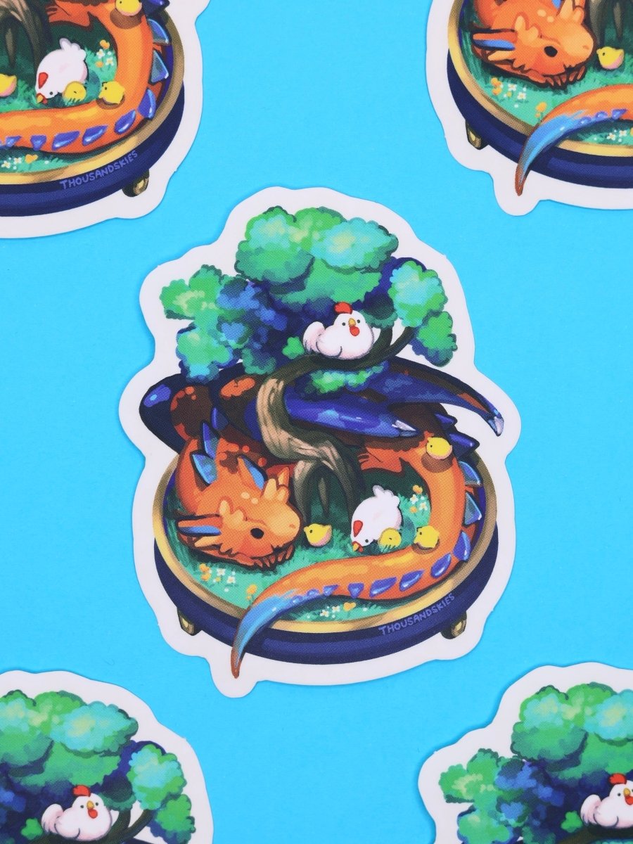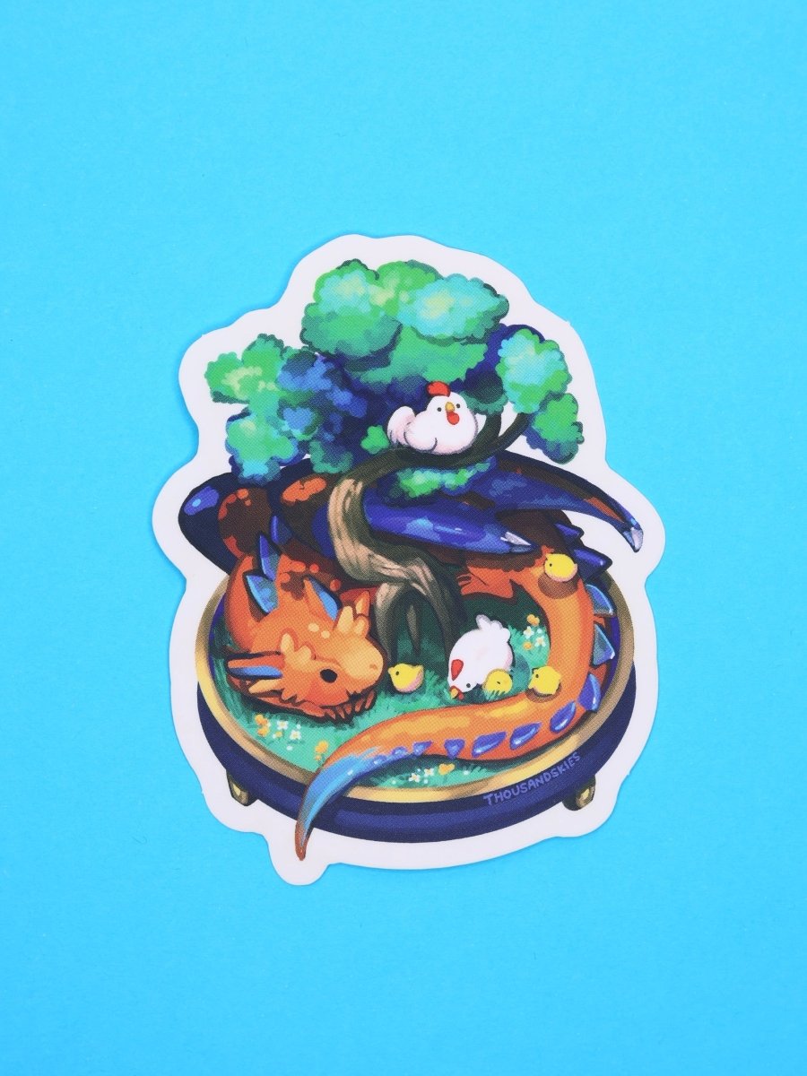 Et fargerikt klistremerke av en bonsai-hage med en drage, høner og kyllinger. Perfekt for å pynte opp vannflasker, postkasse, laptop, mobildeksler, permer, kofferten som kjennetegn, med mer! 🌟💖