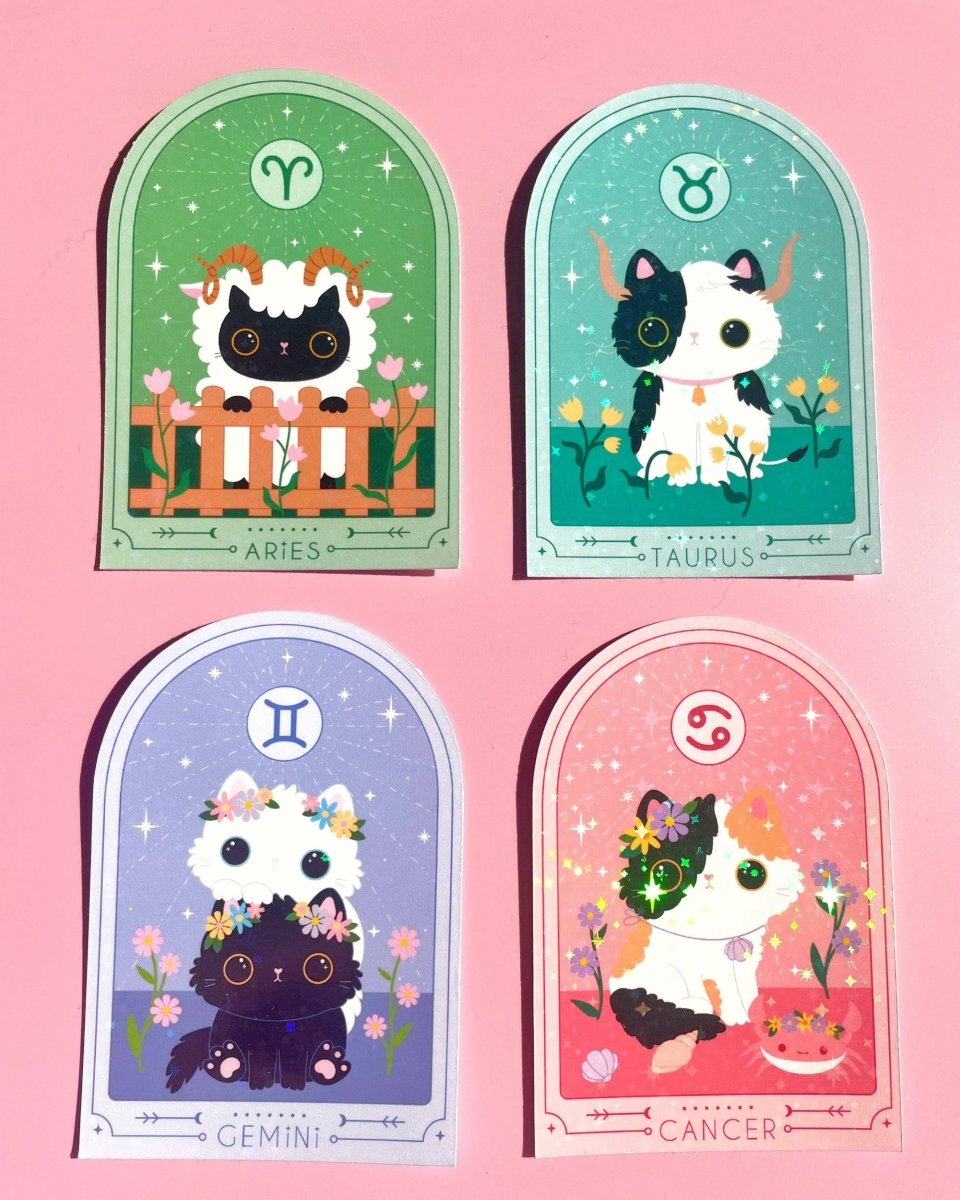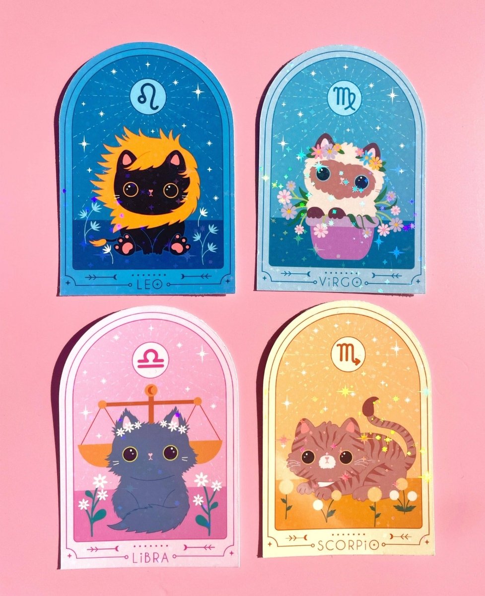 🌸 Våre klistremerker er ideelle for katteelskere og astrologi-entusiaster. Hvert klistremerke er av høy kvalitet, vannavstøtende, og slitesterkt med en glitrende finish som gir litt ekstra magi til dine favoritting ✨