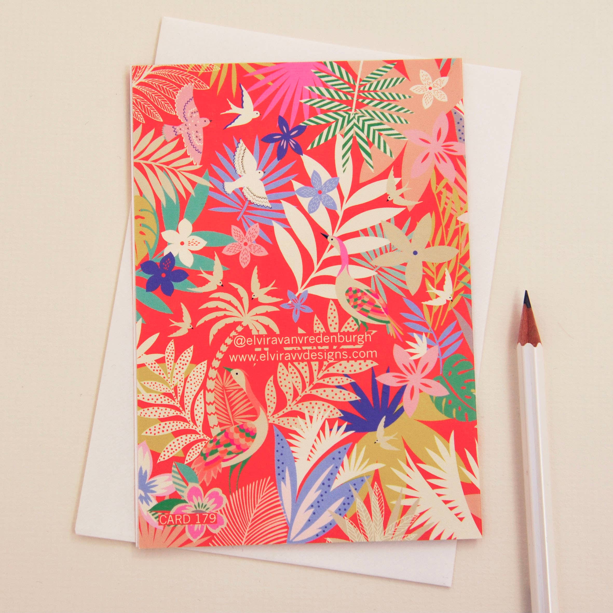 Et jubileumskort illustrert av Elvira Van Vredenburgh med nydelig motiv med blomster og fugler.