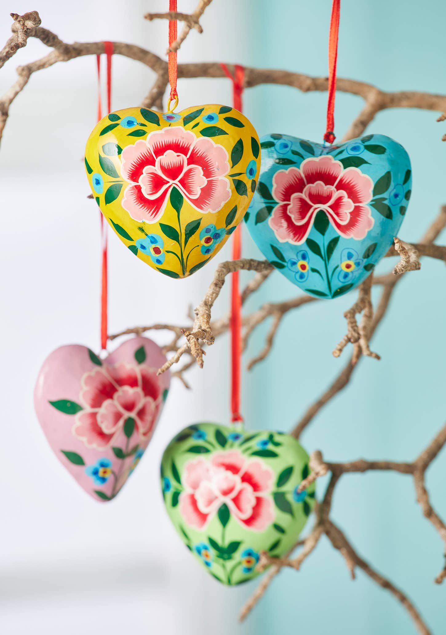 Dekorativ hjerteformet pynt, håndmalt med krysantemum-motiv. Tilgjengelig i fire fargevarianter og levert med rød opphengssnor.