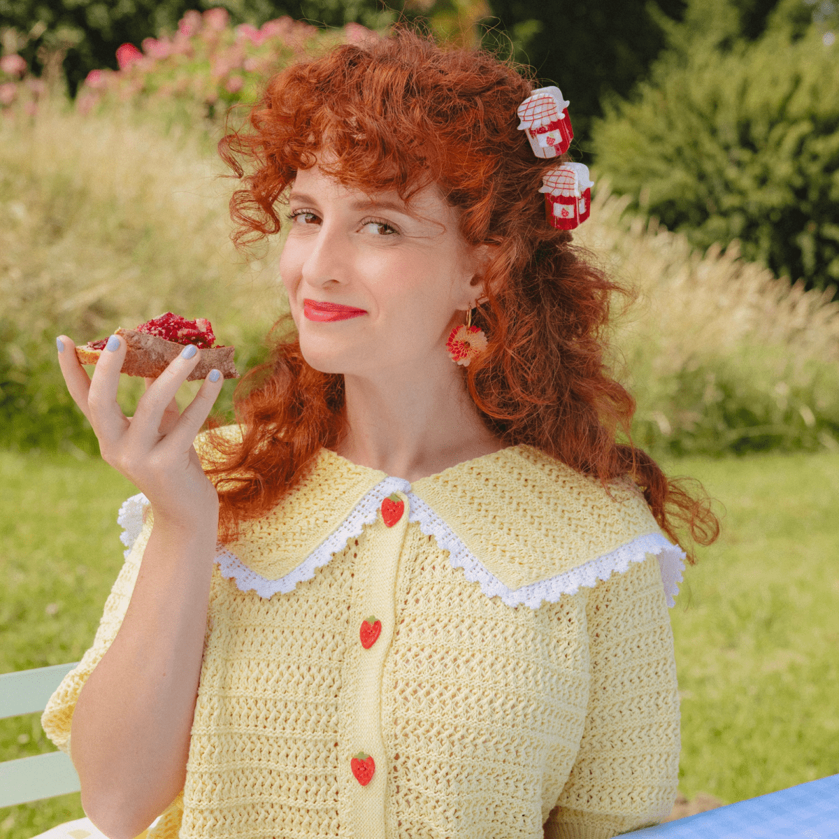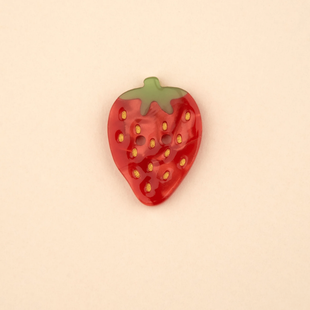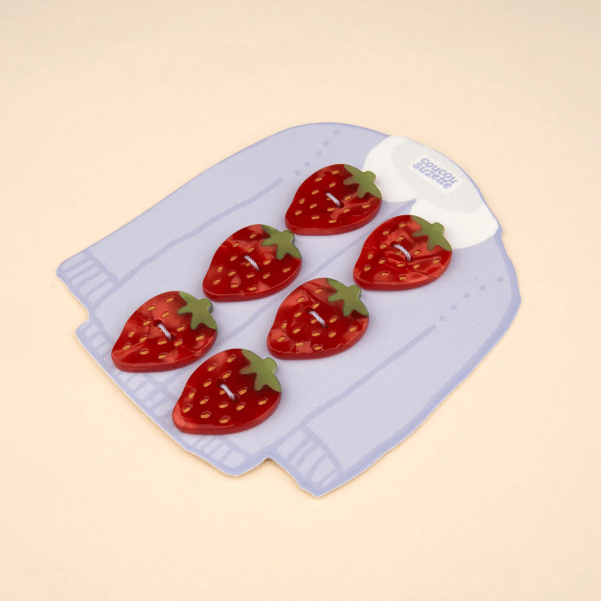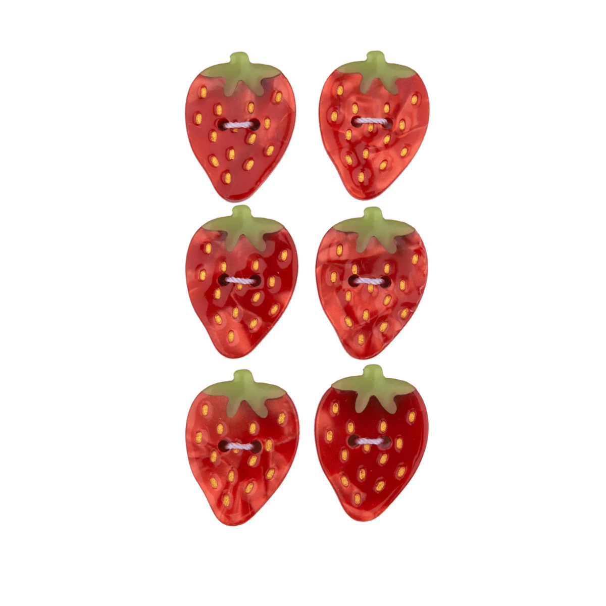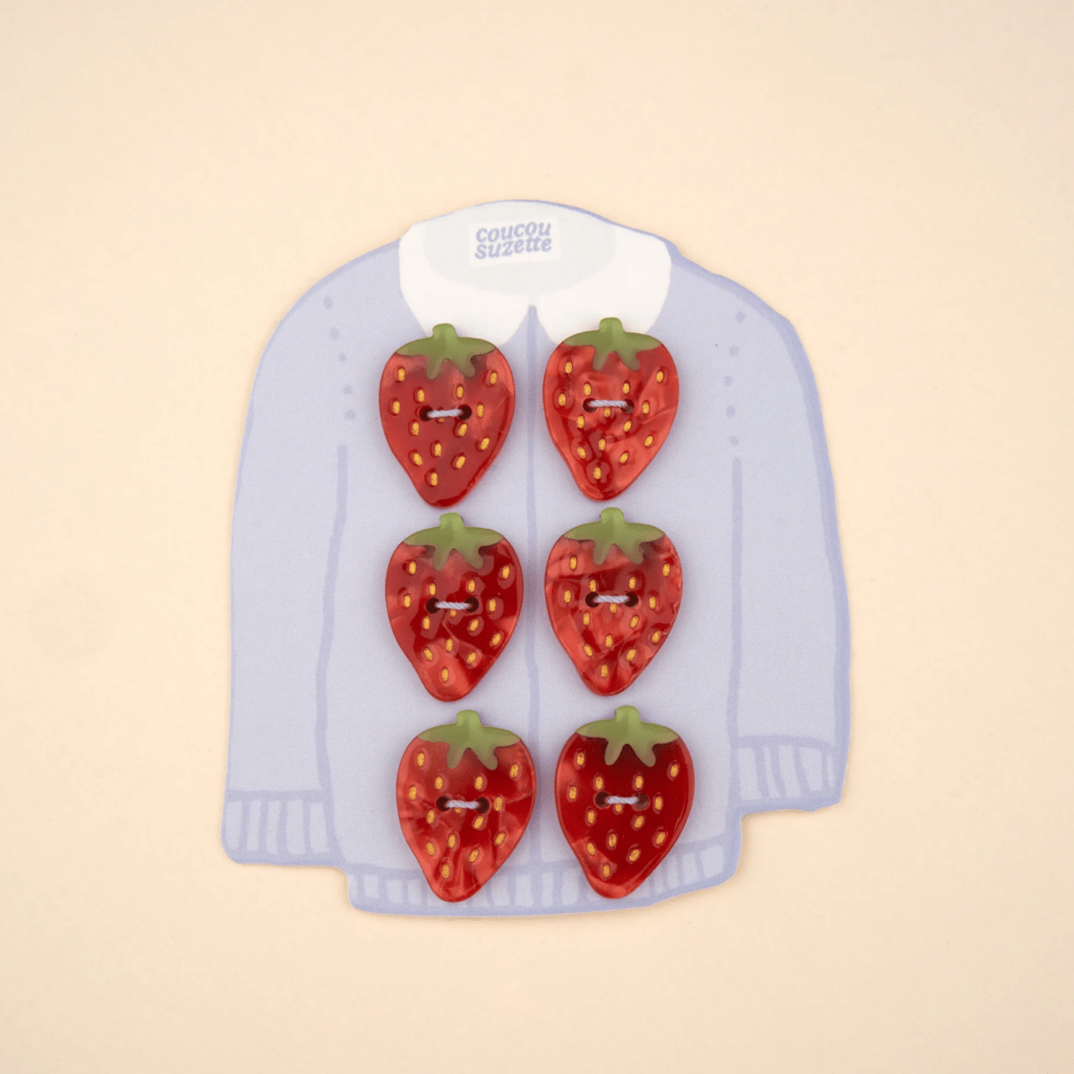 Et sett med 6 knapper formet som jordbær, laget av miljøvennlig og slitesterk celluloseacetat.