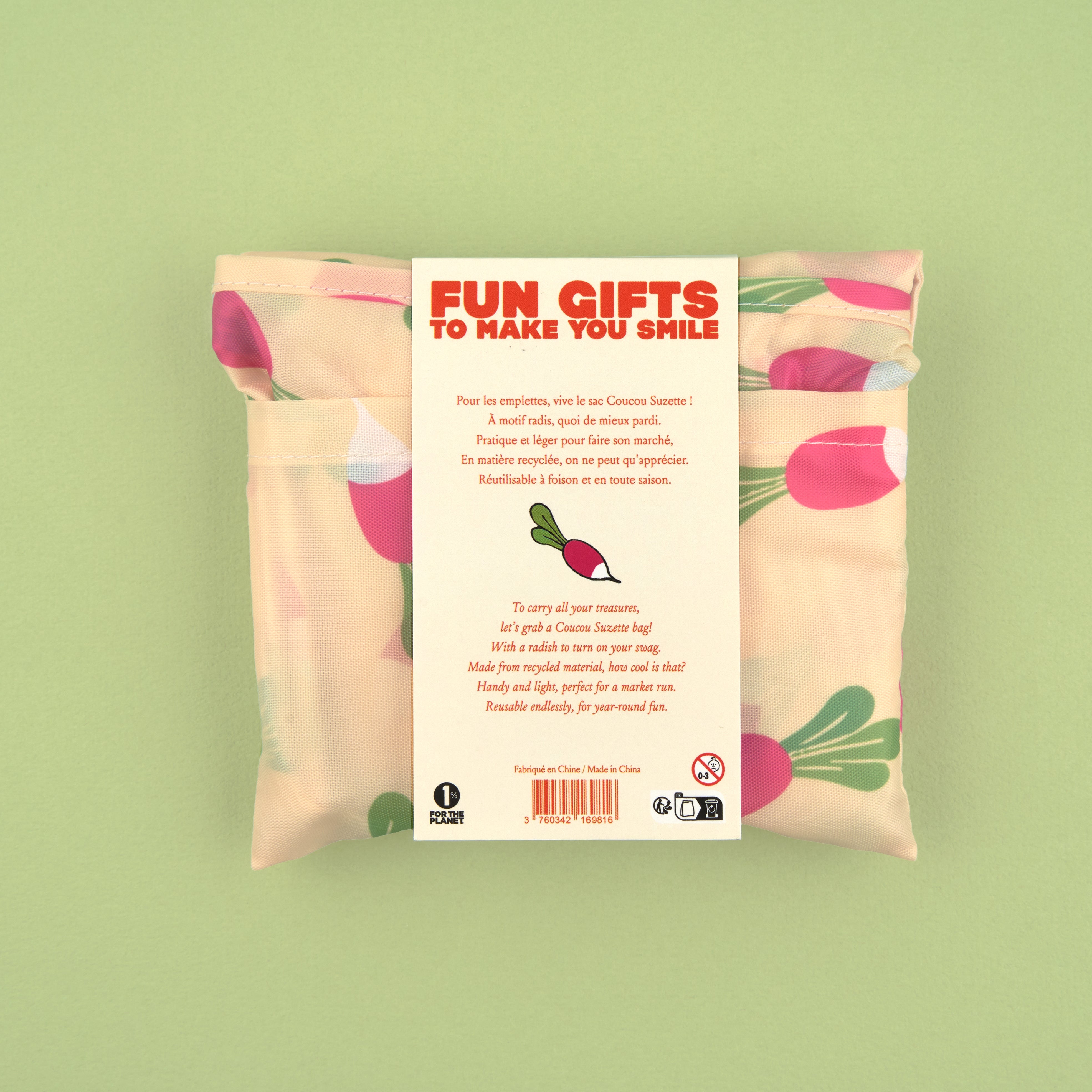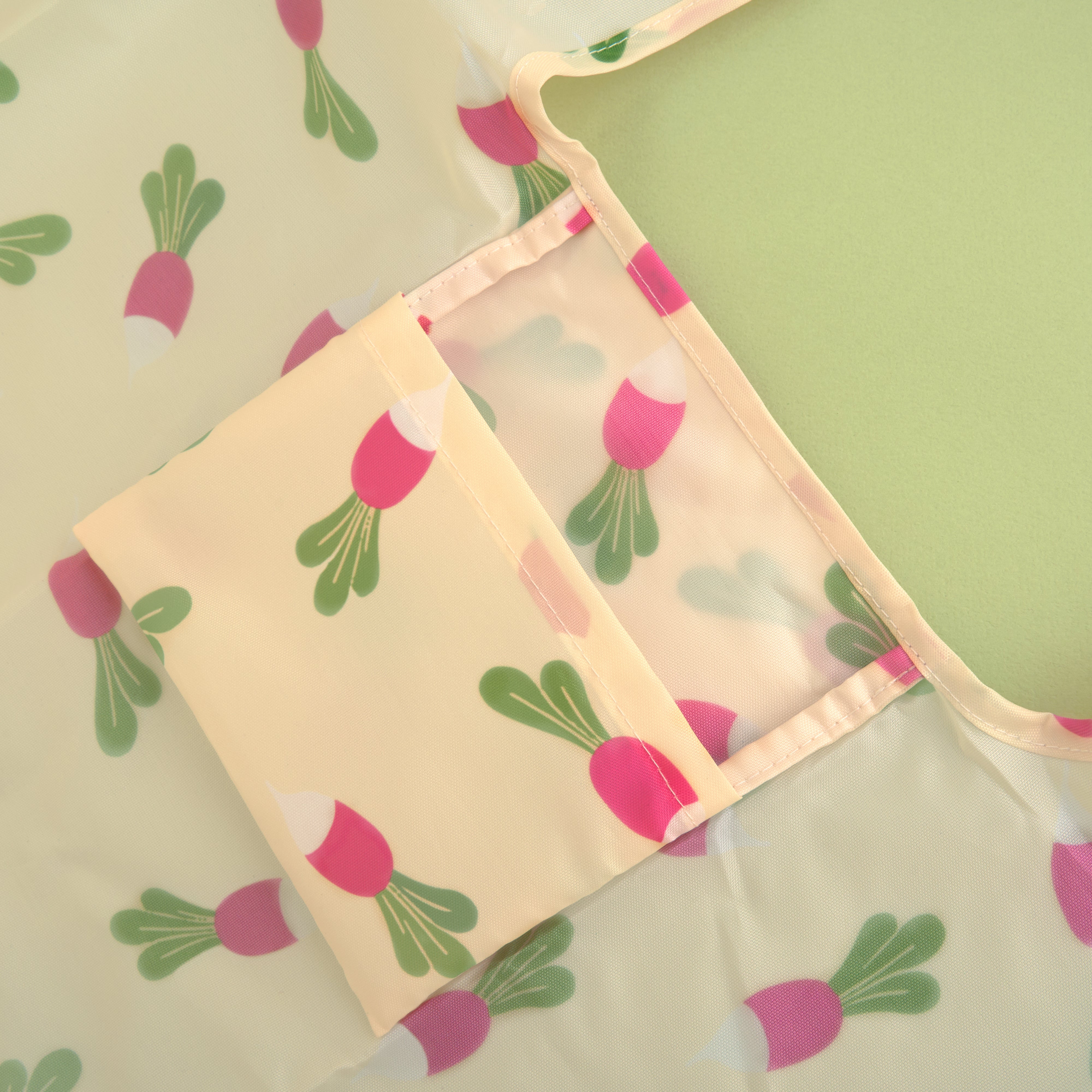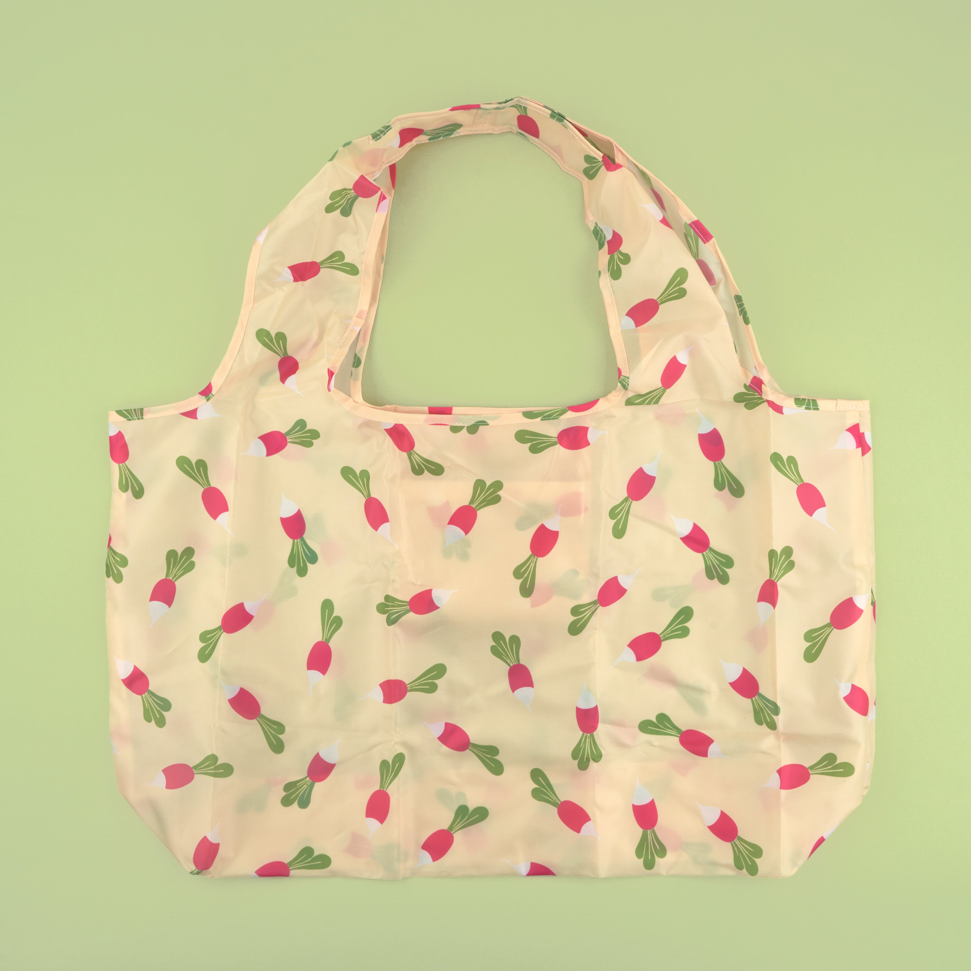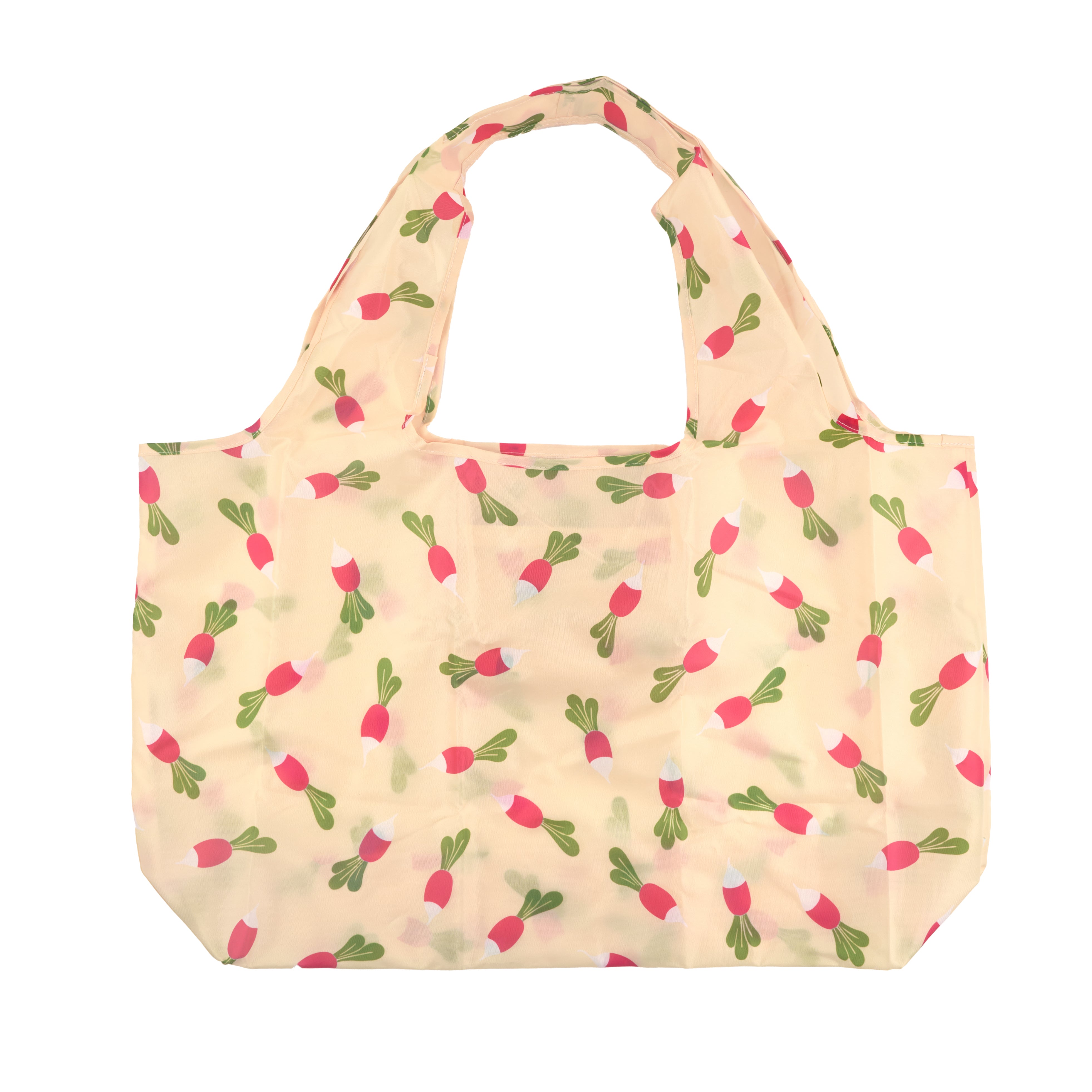 Et lett og praktisk sammenleggbart handlenett med håndtak med søte rediiker på.