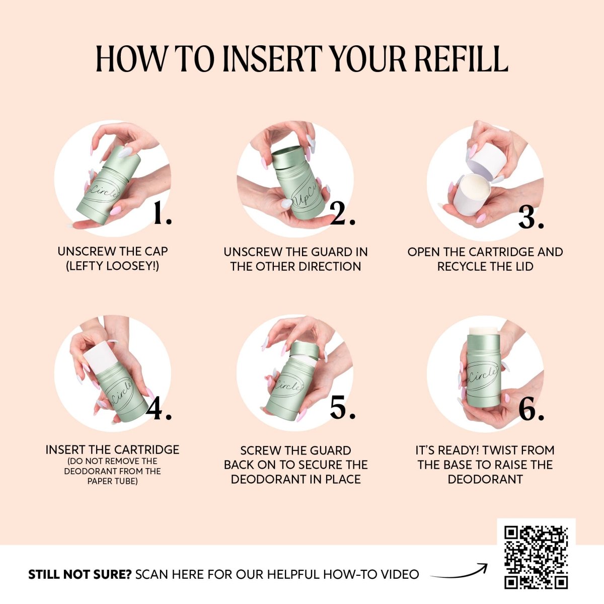 Dette er en refill. Den plasseres i deodorant-beholderen i 100% aluminium fra UpCircle. Refillen kan også prøves alene for å teste formelen, men er mest praktisk å bruke i beholderen.