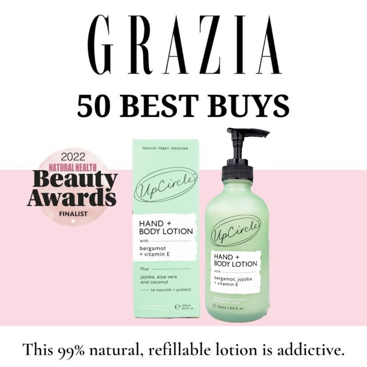 UpCircle-løftet: 100 % vegansk, cruelty-free og produsert i Storbritannia. Leveres i glassflaske med plastpumpe.