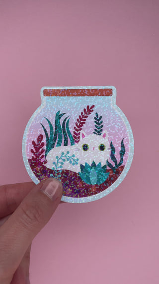 Glitterklistremerke med en søt katt i et terrarium, eller purrrrrarium. Klistremerkene har glitteroverlegg laget av kvalitetsvinyl som er holdbar og vannavstøtende, og VELDIG glitrende.