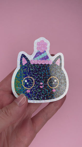 Glitterklistremerke med en søt katt med party hatt. Klistremerkene har glitteroverlegg laget av kvalitetsvinyl som er holdbar og vannavstøtende, og VELDIG glitrende.