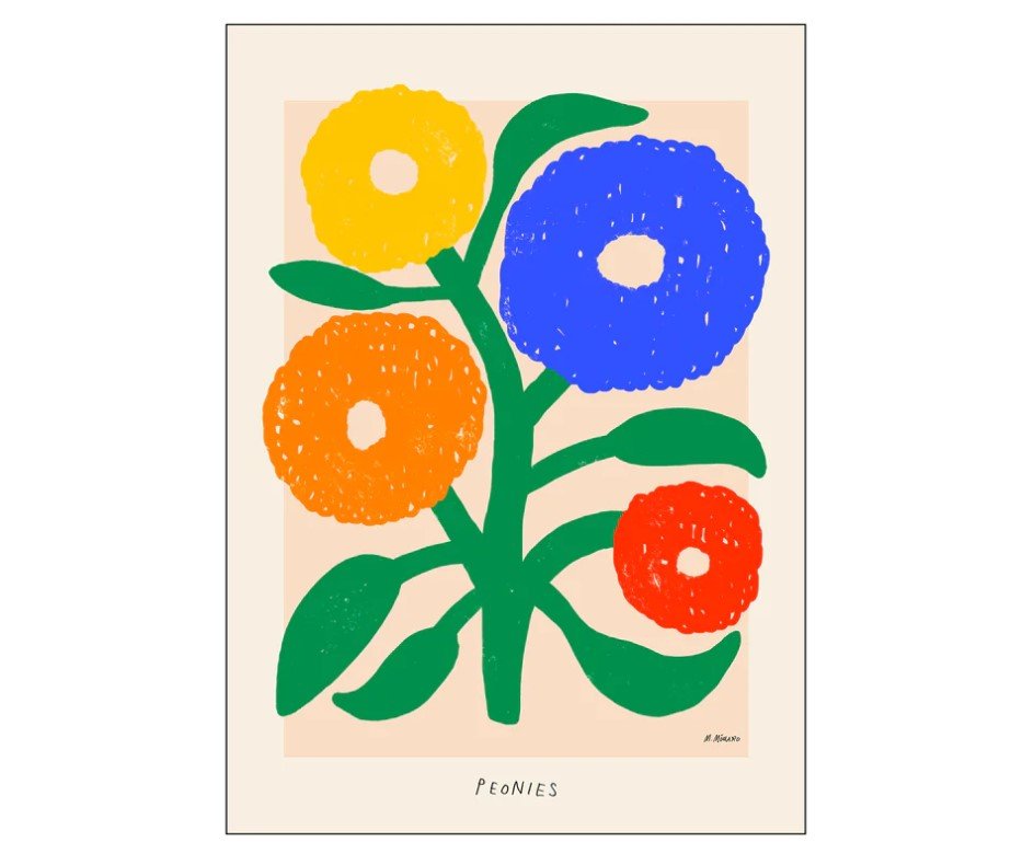 Peonies Poster av svenske Madelen Möllard. En energi-injeksjon av et bilde med blomster i sterke farger i gul, oransje, rød og blå.